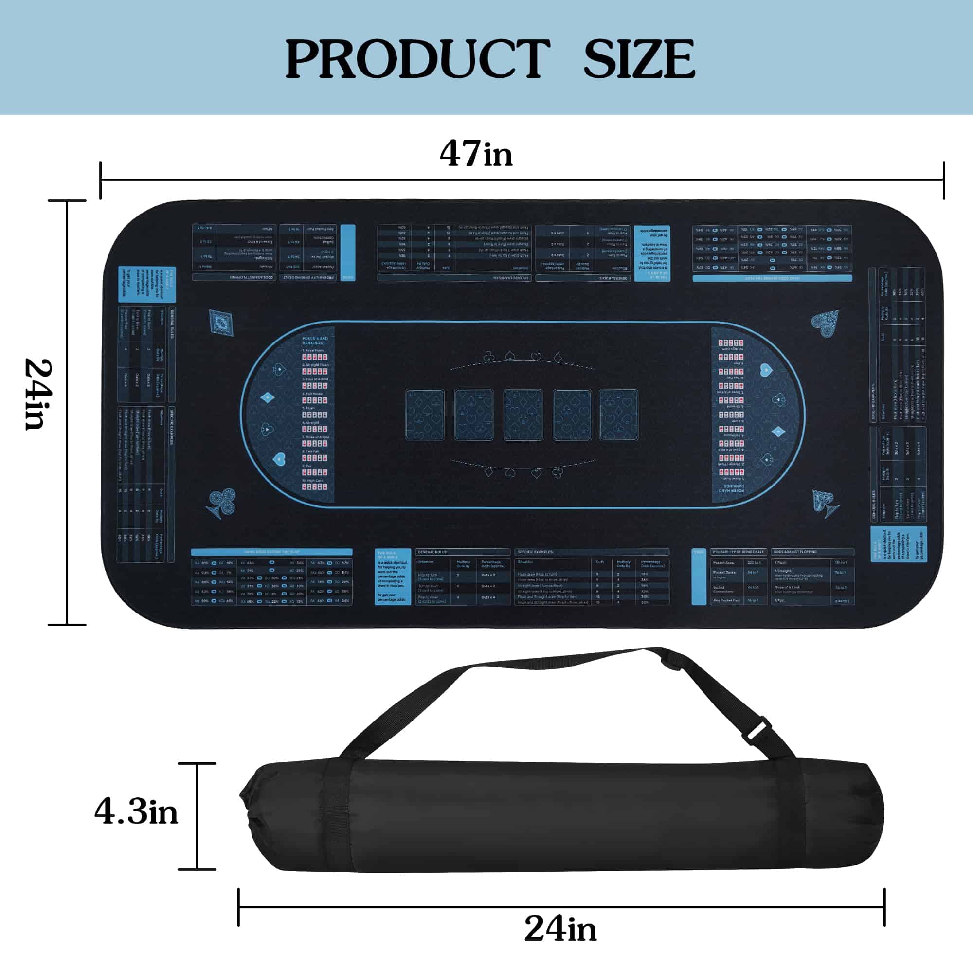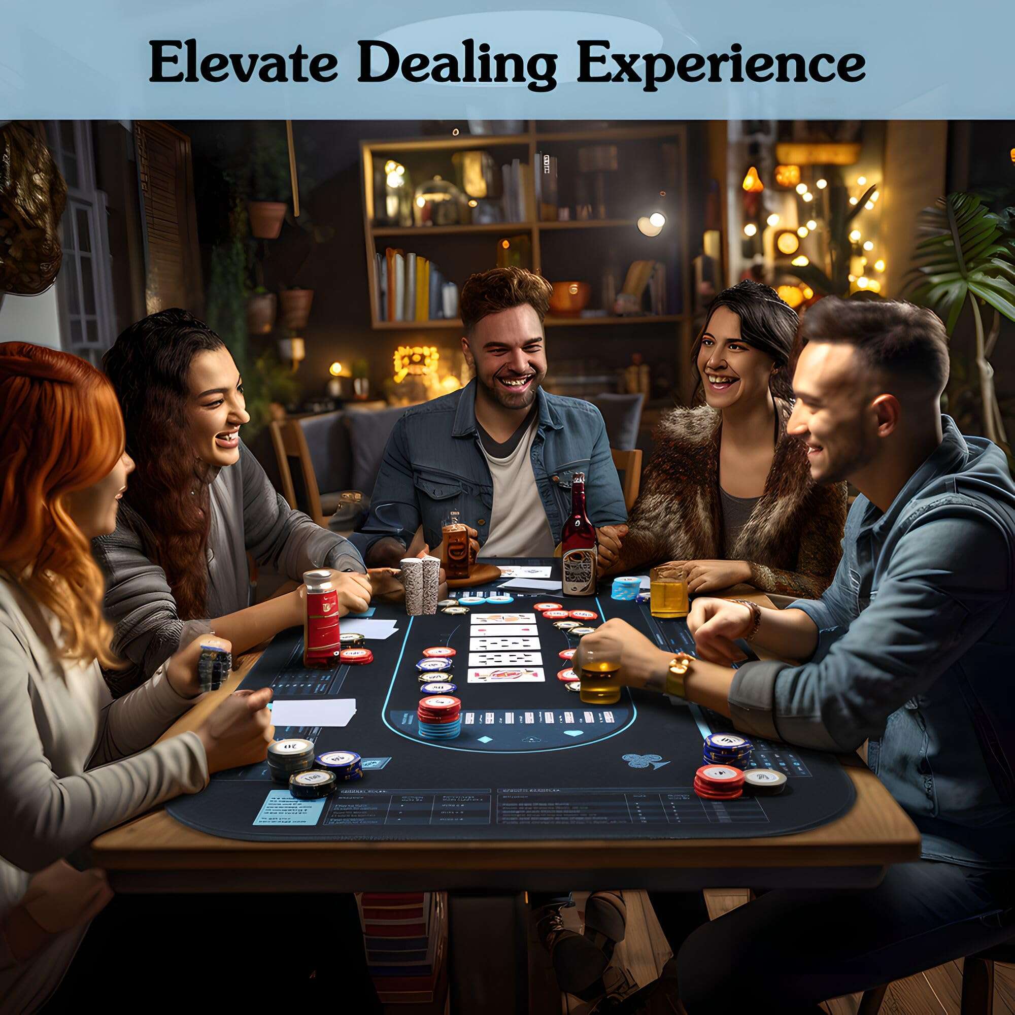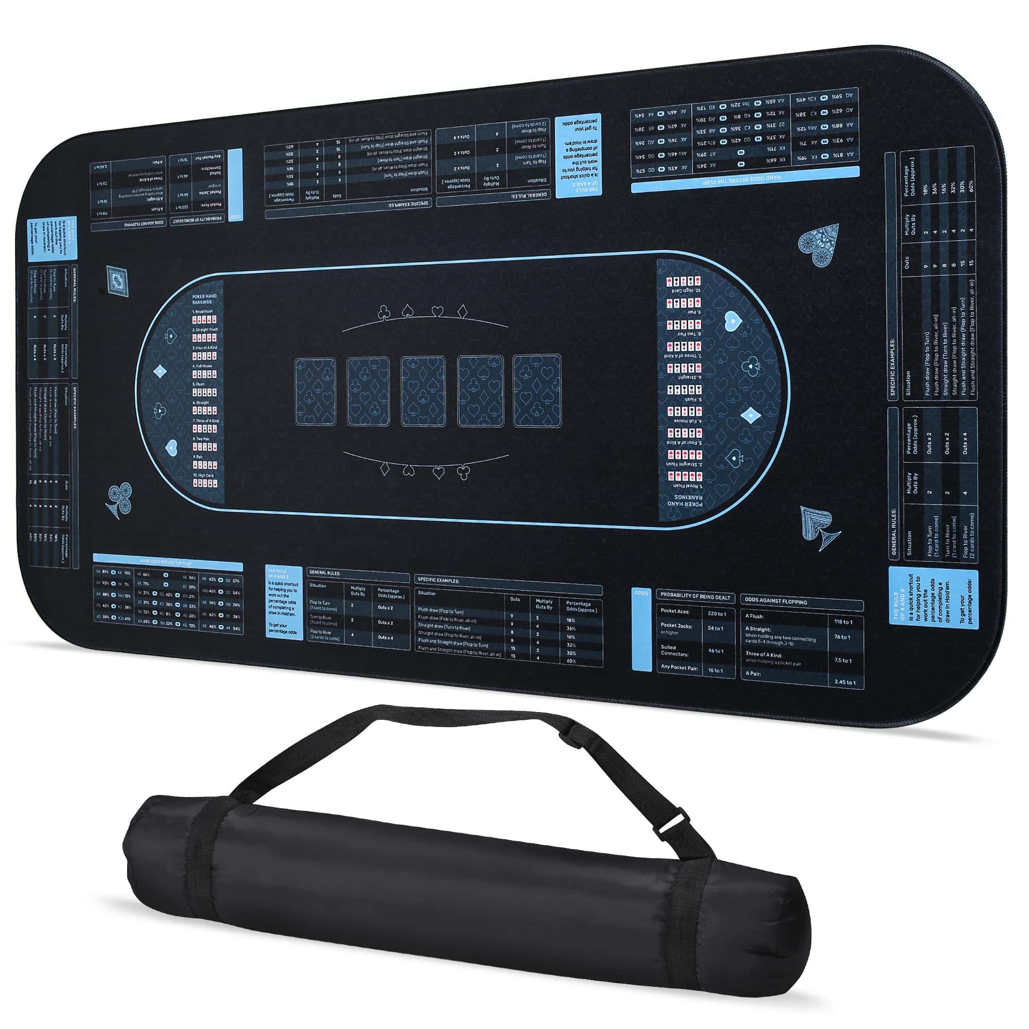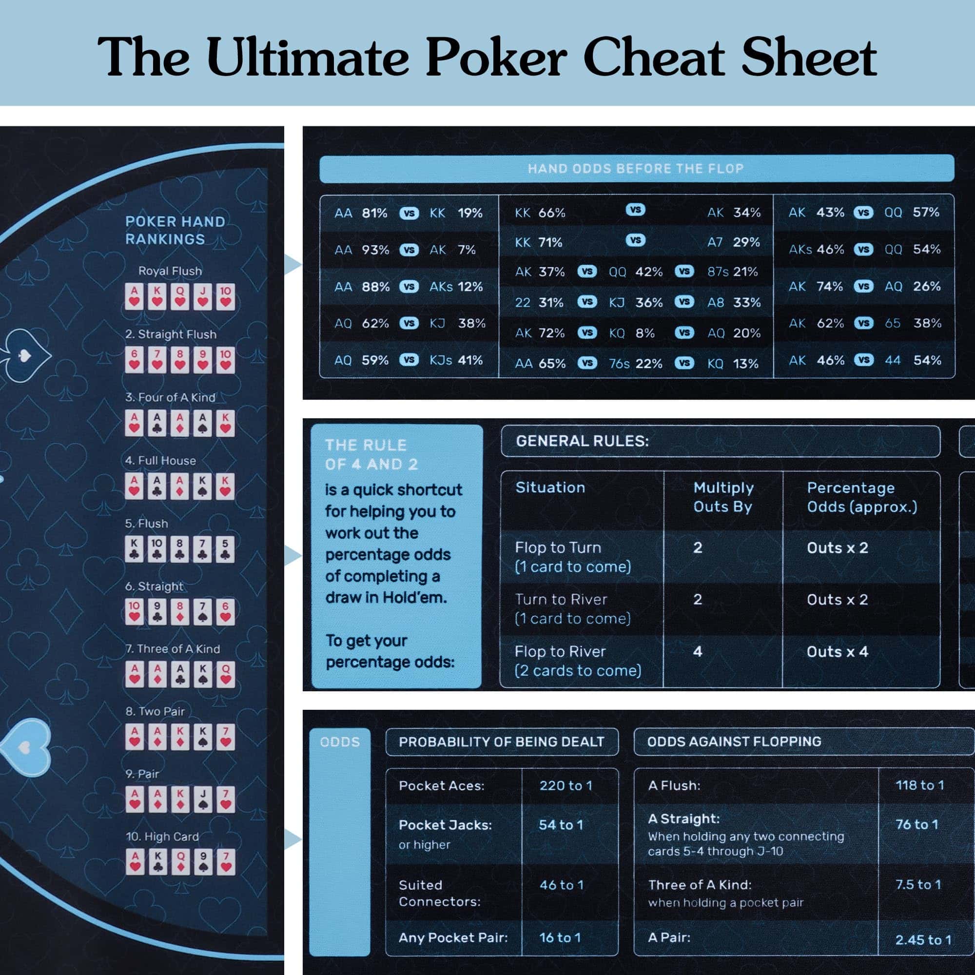 Diseño único con Hoja de Trucos: Nuestro Tapete de Poker cuenta con una exclusiva Guía de Probabilidad de Poker. Incluye clasificaciones básicas de poker para principiantes, probabilidades de recibir manos específicas como AA en el bolsillo, probabilidades de recibir manos como una escalera de color o trío en el flop, y la regla clásica de 4 y 2 para calcular probabilidades. Esta herramienta empodera a los jugadores para planificar mejor, mejorando la participación y diversión en cada juego.