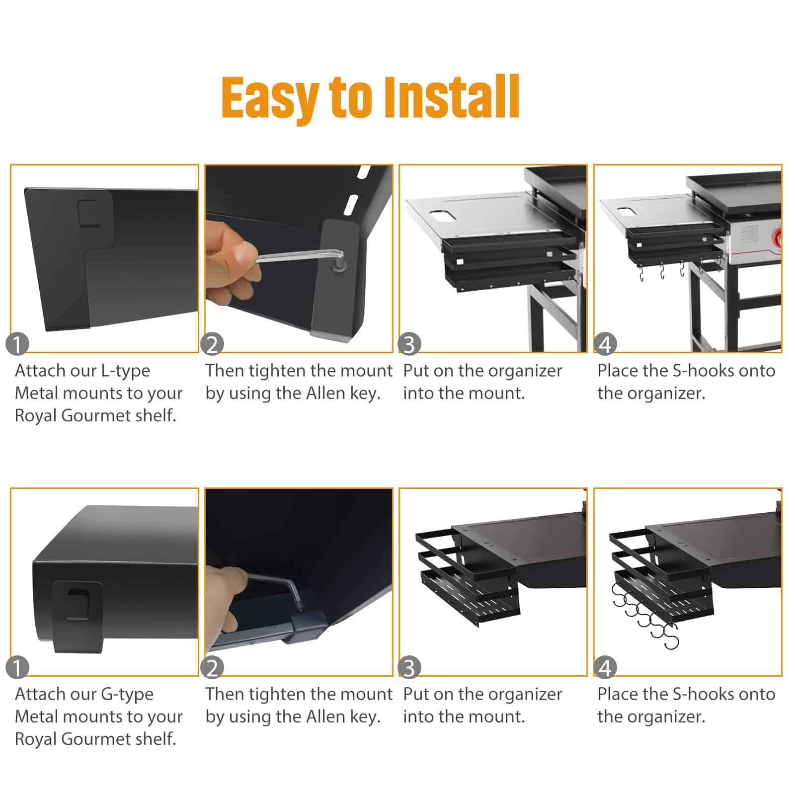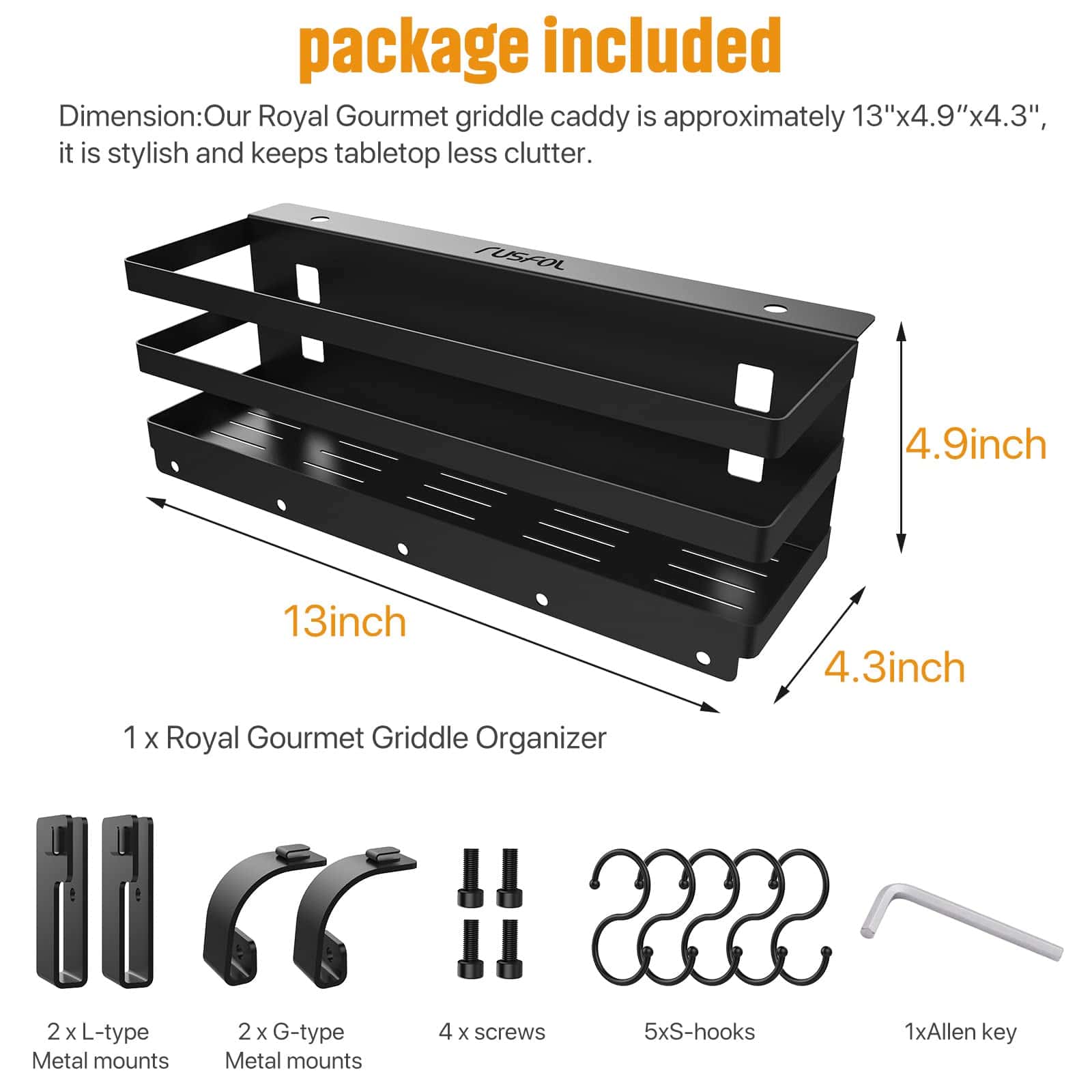 5. Fácil de Instalar: El caddy de la parrilla es fácil de usar y se puede instalar fácilmente. Nuestro RUSFOL Caddy de Parrilla Royal Gourmet tiene aproximadamente 13″x4.9 x4.3″, es elegante y mantiene menos desorden en la mesa, paquete incluido: 1 x Organizador Royal Gourmet, 5 x ganchos en S, 2 x soportes de metal tipo G, 2 x soportes de metal tipo L, 2 x tornillos, 1 x llave Allen. ¡Servicio de reemplazo de 1 año!