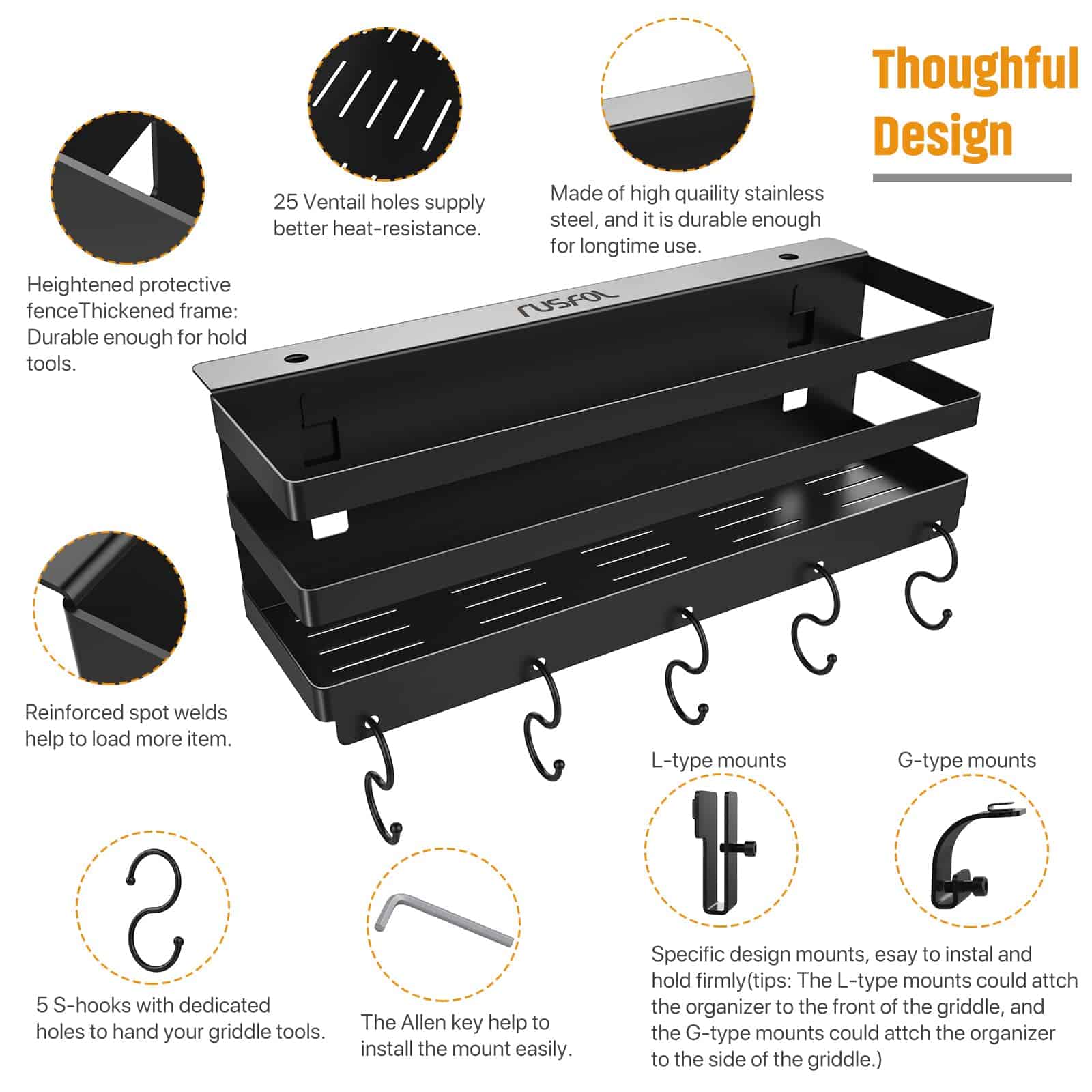 4. Bien organizado: Con nuestra construcción bien pensada, todos sus accesorios para la parrilla se pueden organizar perfectamente. Mantenga todo en orden después de cada uso.