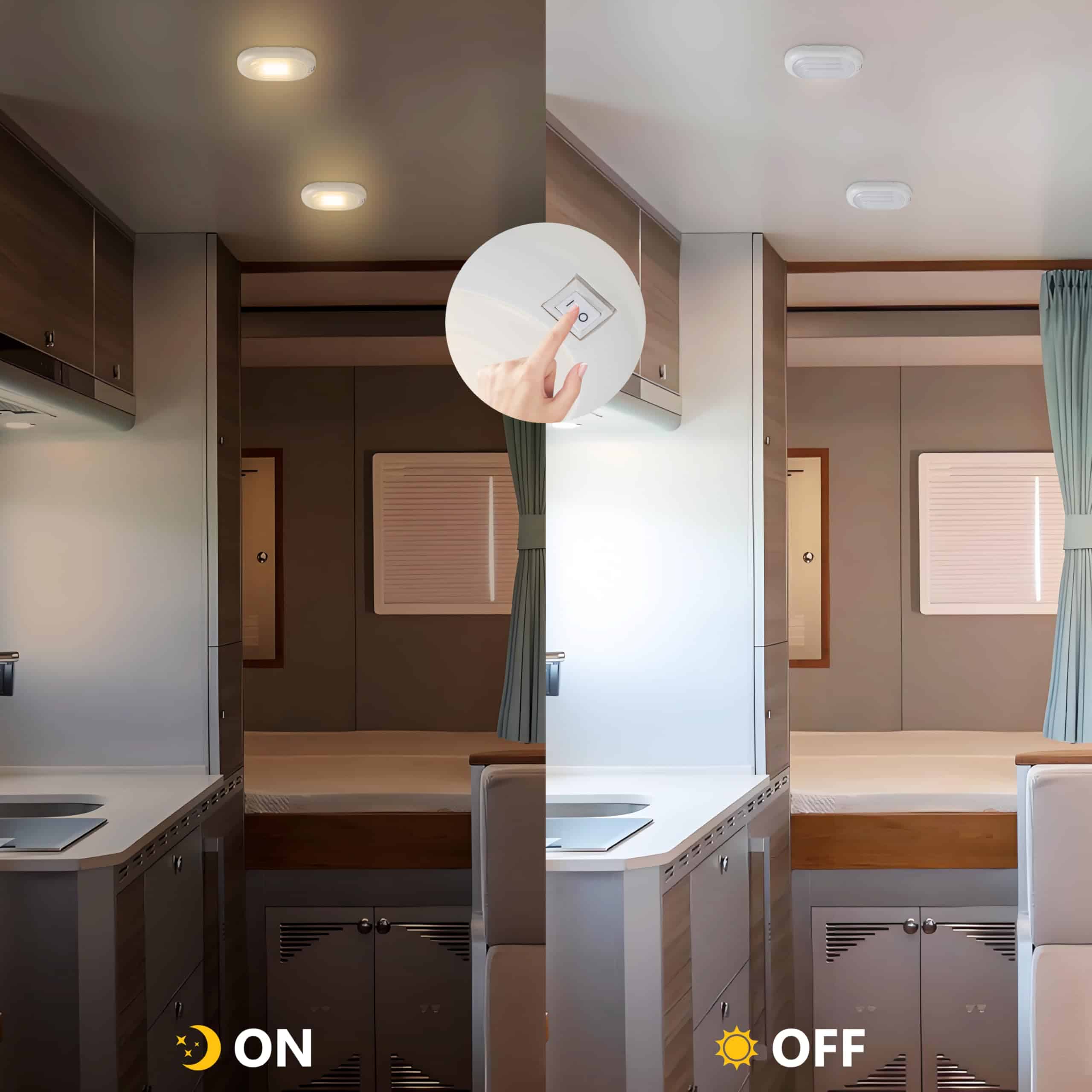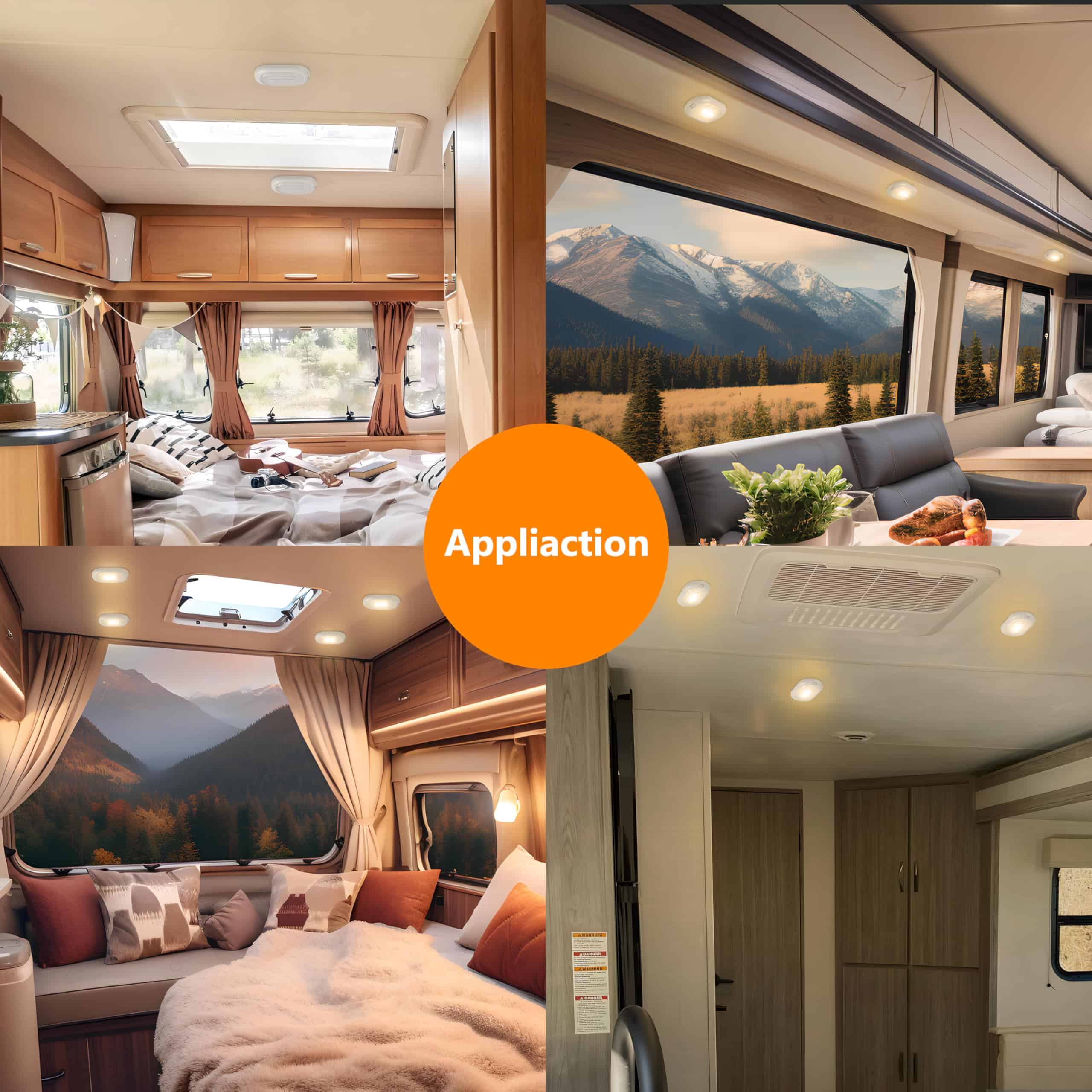 4. Amplia Aplicación Equipada con un interruptor de encendido/apagado, controle fácilmente la luz en cualquier momento, adecuada para RVs, remolques, autos, campers y botes. Si se usa como iluminación de techo interior, se requiere un transformador de bajo voltaje DC 12V, proporcionando suficiente luz en armarios, oficinas o espacios comerciales.