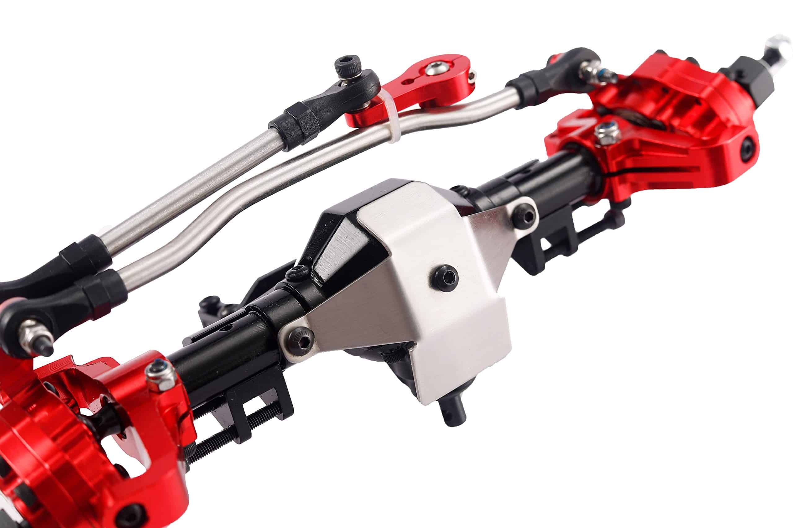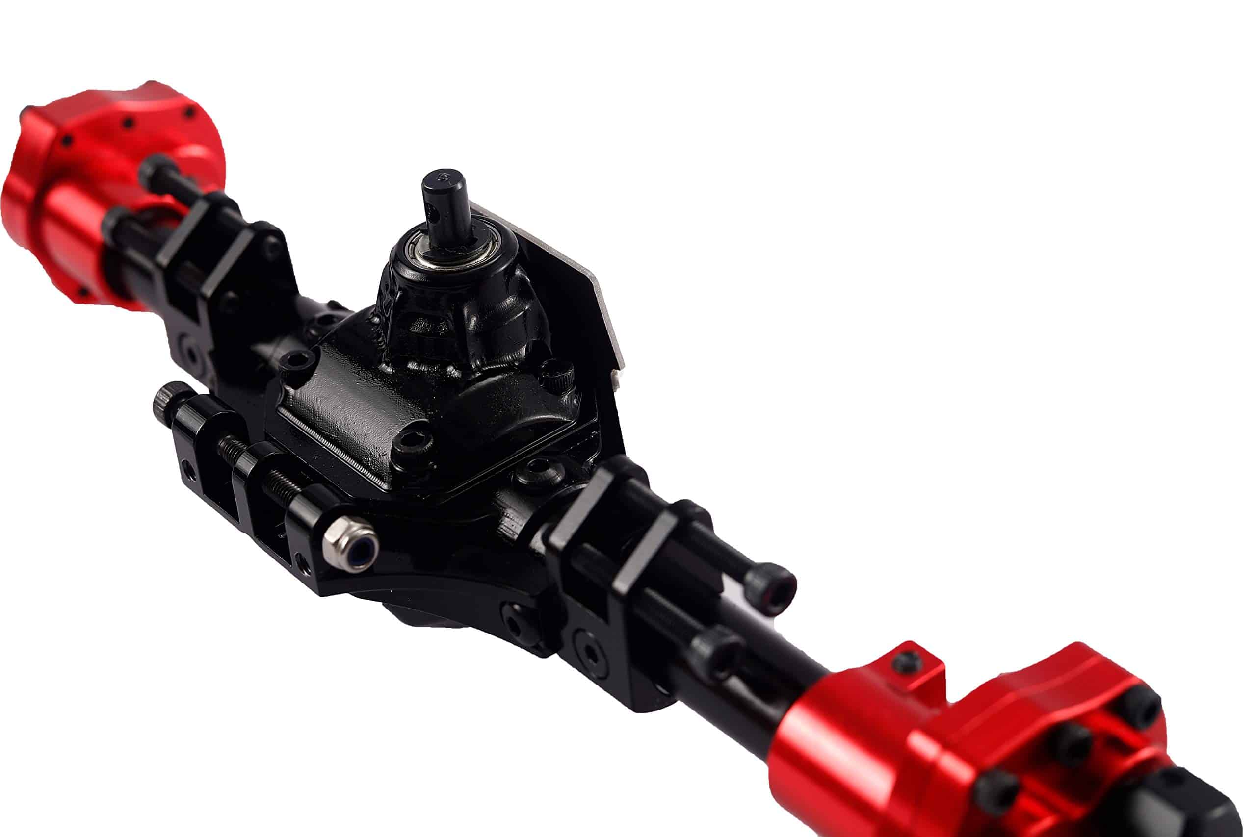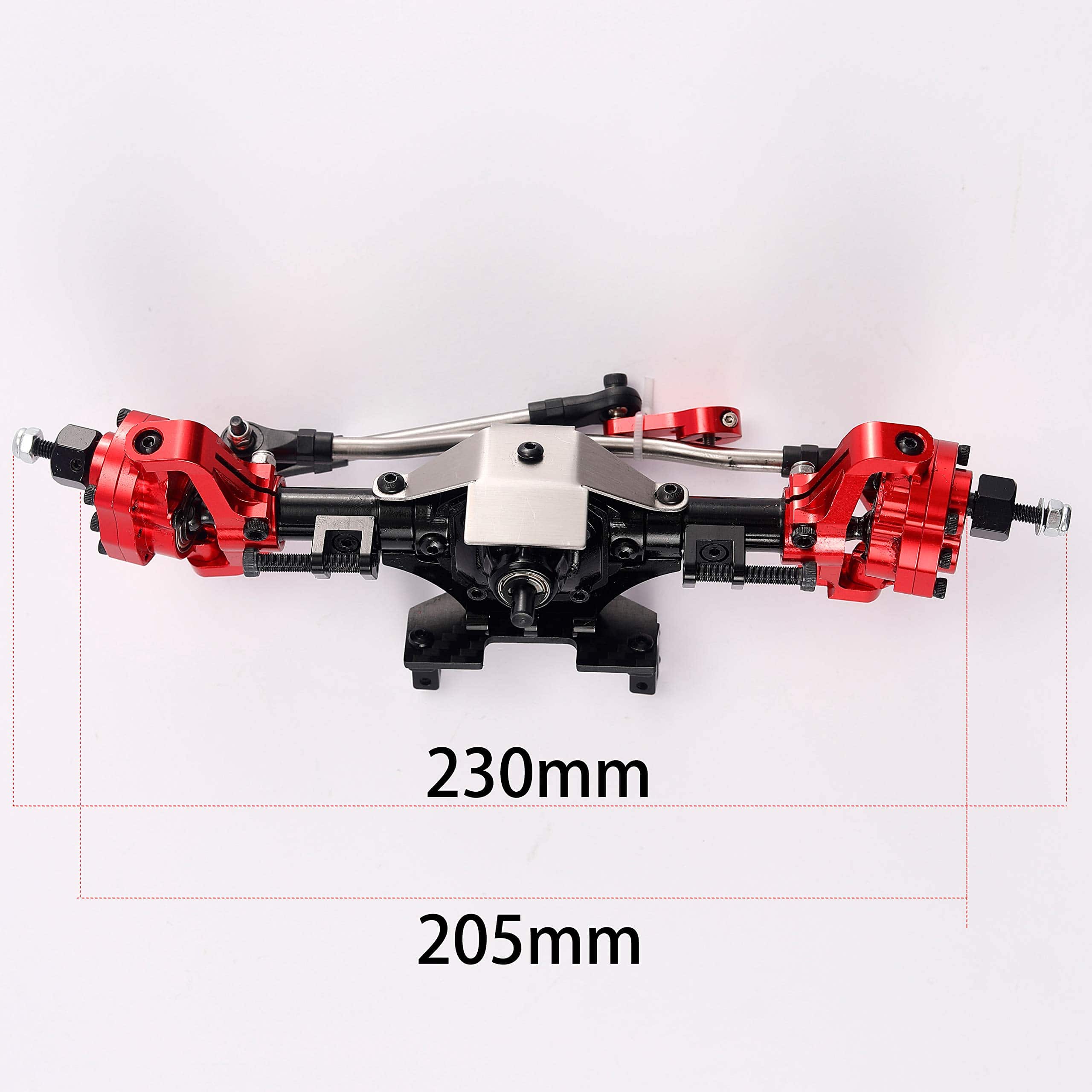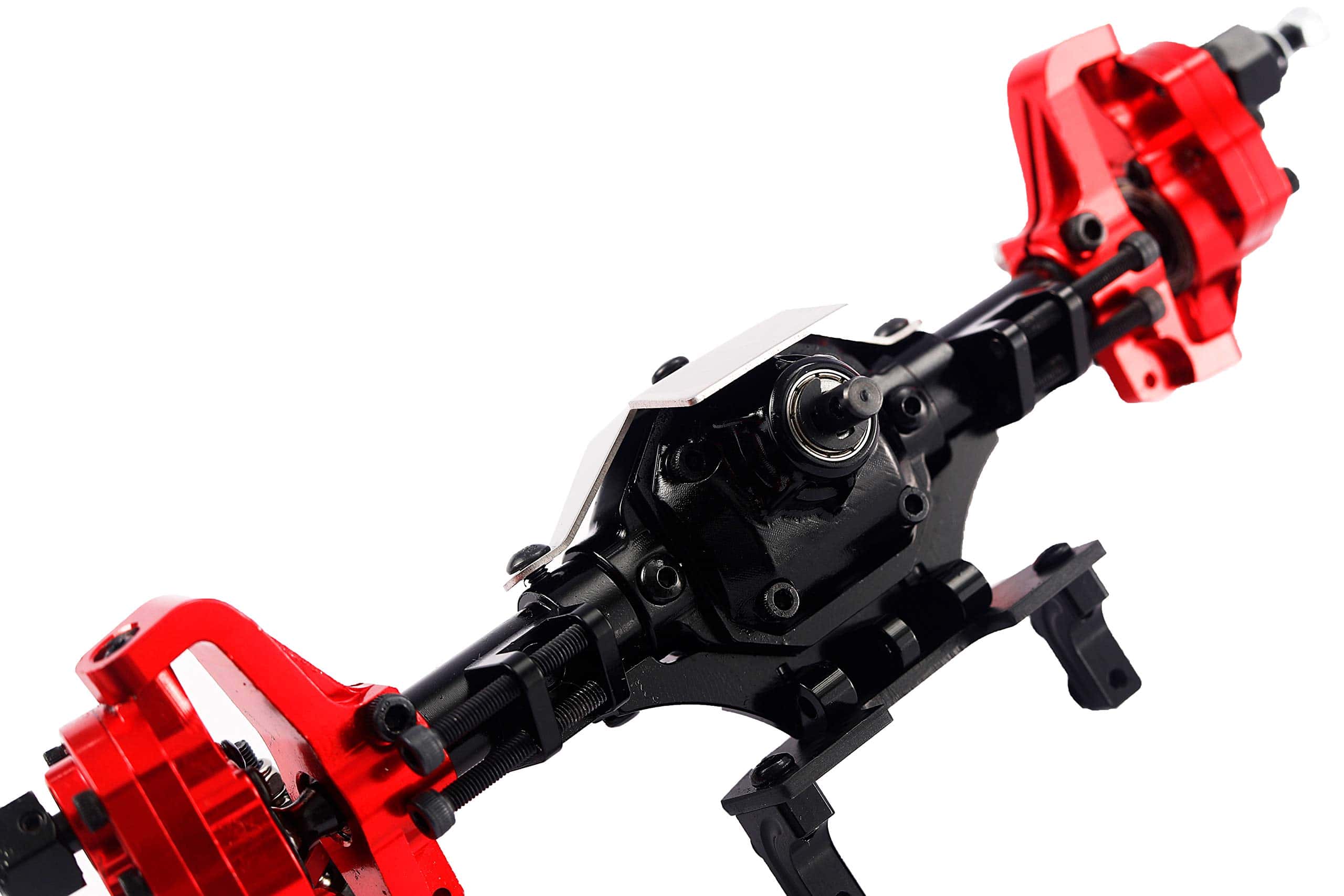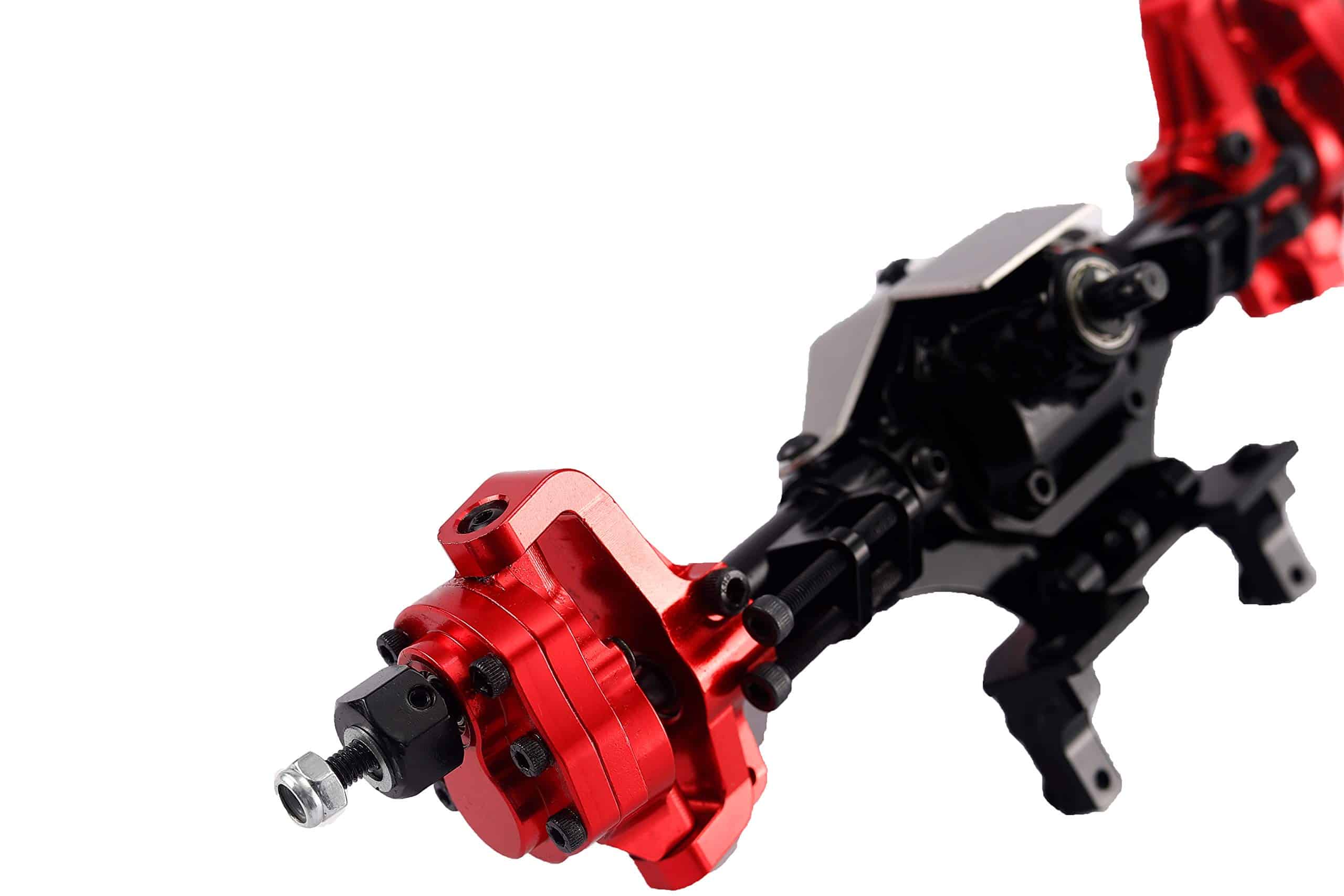 Material: Aleación. Color: Negro con Rojo. Usando tecnología CNC. Adecuado para modelo de coche Crawler Axial SCX10 1:10. Materiales de alta calidad y artesanía excelente. El upgrade ligero mejora instantáneamente el rendimiento general en manejo y durabilidad. Peso: 580g 1.27lbs. Incluye: 1 x Eje Delantero para 1/10 SCX10, 1 x Eje Trasero para 1/10 SCX10.