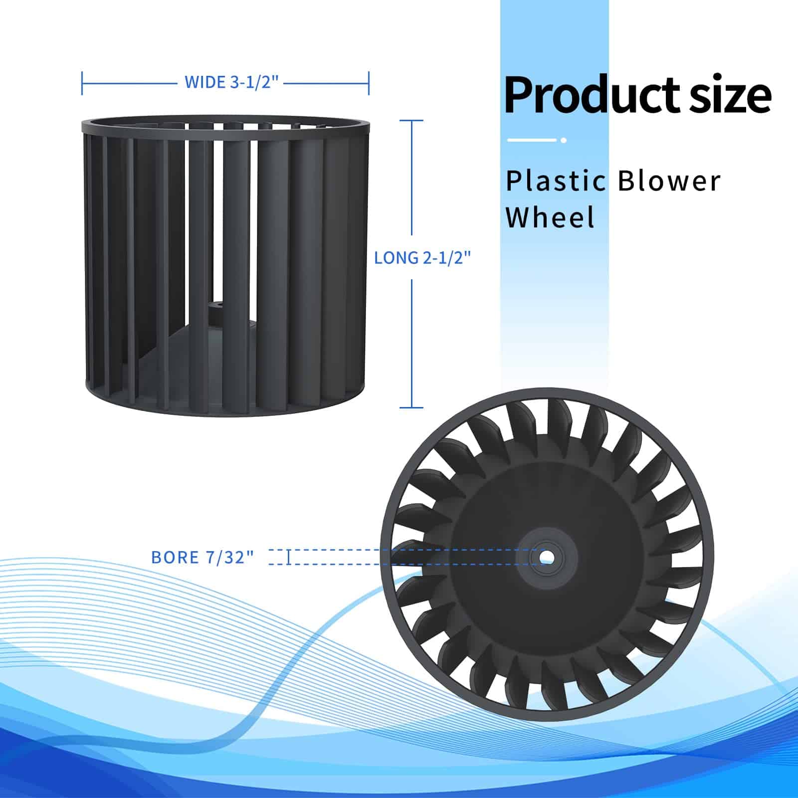 Nutone Plastic Blower Wheel S97010255. Fits models 162 G,J,K,L and M, 164-G,J,K,L, and M. Number molded into wheel is 99110872. Size is 3-1/2″ Wide» x 2-1/2″ Long x 7/32″ Bore, w/ flat and metal retention spring clip Rotation is ccw viewing the opened end of the blower wheel