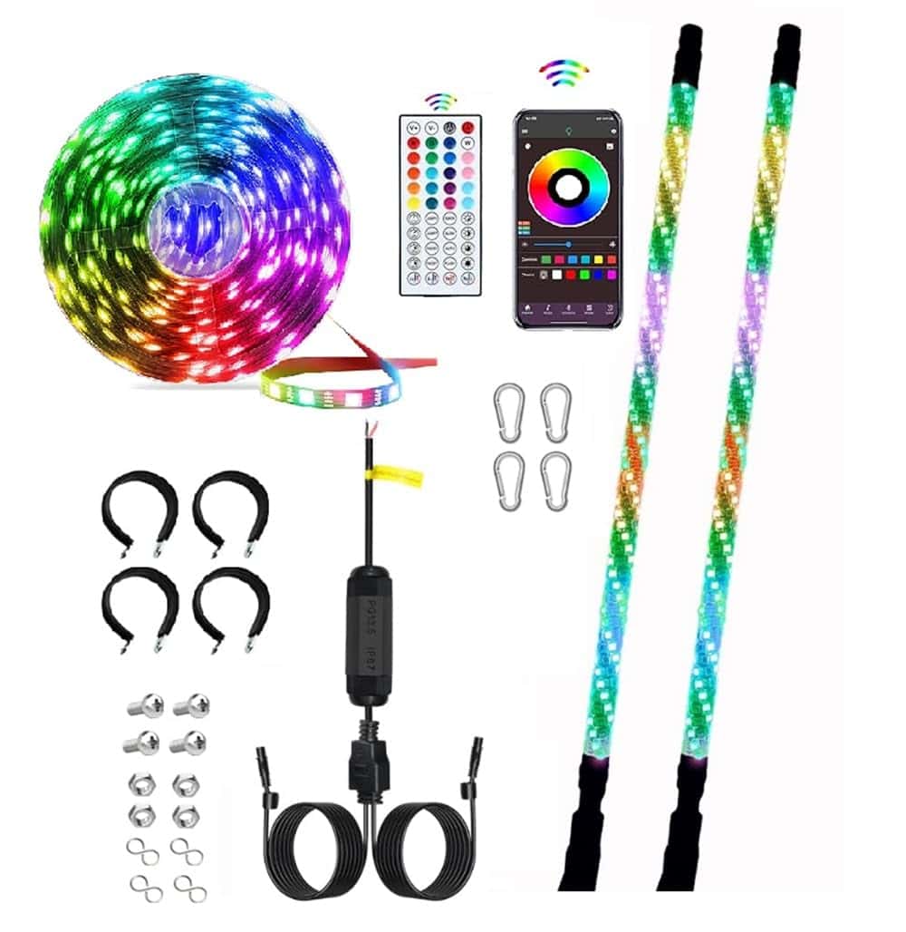 Luces de Látigo LED: Ilumina la noche con nuestras luces de látigo LED con diseño en espiral que ofrecen una luminiscencia de 360°. Con cientos de modos de baile como persecución, acumulación, estroboscópico, pulso, escaneo, apilamiento y 32 colores puros, nunca te quedarás sin opciones para crear el ambiente perfecto.