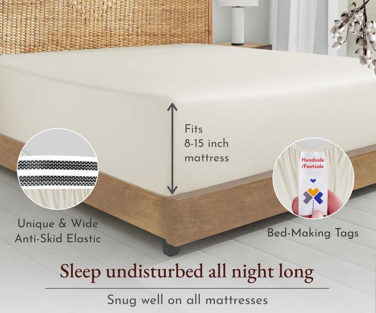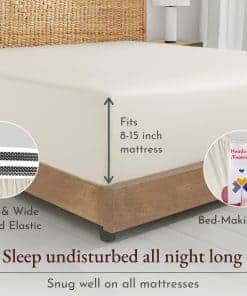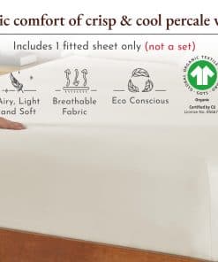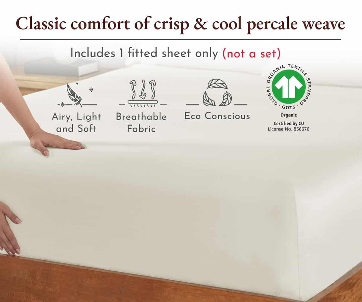 Nuestra sábana ajustable tamaño King de color Marfil Natural está equipada con un elástico super resistente alrededor para que se ajuste perfectamente a tu colchón y no se agrupe. La sábana ajustable antideslizante se mantiene en su lugar toda la noche sin deslizarse y tiene un ajuste versátil, lo que la hace apta tanto para colchones de espuma viscoelástica altos como bajos. Las etiquetas inteligentes en la cabecera y los pies garantizan hacer la cama súper fácil y sin complicaciones. Nuestras sábanas de percal hechas con tejido de percal destacan por su durabilidad excepcional. El tejido clásico de percal garantiza comodidad duradera y sin bolitas. Es lavable a máquina, conserva el color y se suaviza con el tiempo. Solo retíralo rápidamente de la secadora para mantener las arrugas a raya. Esta sábana ajustable de percal está hecha de algodón orgánico, diseñado para ser saludable para todos. En 2022 y 2023, donamos más de 22,000 piezas de ropa de cama a organizaciones benéficas locales en EE. UU. No utilizamos plástico en nuestro embalaje y nuestras sábanas son producidas en nuestra fábrica familiar en la India. Cada pieza se inspecciona para garantizar la calidad, y prometemos reemplazar cualquier producto defectuoso sin costo alguno. Compra con confianza con nuestra política de devoluciones de 30 días, incluso si has lavado o usado nuestro producto.