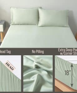 1. RECARGA TU ALMA: Envuélvete en el lujo de las sábanas de 100% viscosa de bambú y despertarás sintiéndote renovado y refrescado. Ligeras y sedosas, hipoalergénicas y que absorben la humedad, estas sábanas te mantienen fresco en verano y cálido en invierno. 2. REDISEÑA TU ESTILO DE VIDA: Con un conteo de 400 hilos, la calidad superior de estas sábanas de viscosa derivada del bambú es un sueño para dormir, volviéndose más suave con cada lavado. La sábana ajustable con bolsillo extra profundo de 18″ se adaptará incluso a los colchones más gruesos. 3. RENUEVA TU SUEÑO: Puedes descansar bien en ropa de cama de lujo sabiendo que tus sábanas han sido probadas y certificadas libres de más de 100 sustancias químicas dañinas con la certificación OEKO-TEX 100. 4. REAVIVA TU RELACIÓN: Mejora cada parte de tu relación mientras te acurrucas con tu ser querido y disfrutas de la suave y sedosa felicidad tejida de la viscosa hecha de bambú. 5. AÑADE AL CARRITO CON CONFIANZA en nuestra Garantía de Satisfacción del 100% para el Cliente!