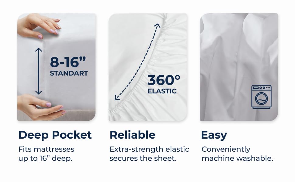 7. Banda elástica de premium clase. Gracias a la banda elástica premium universal y al bolsillo profundo, la sábana se ajusta perfectamente al colchón. Por eso, la sábana no se desliza ni se enrolla, ni se cae por la noche. Eso convierte a la sábana en uno de los elementos esenciales. ¡Hemos pensado en todo para ti, todo lo que tienes que hacer es disfrutar!