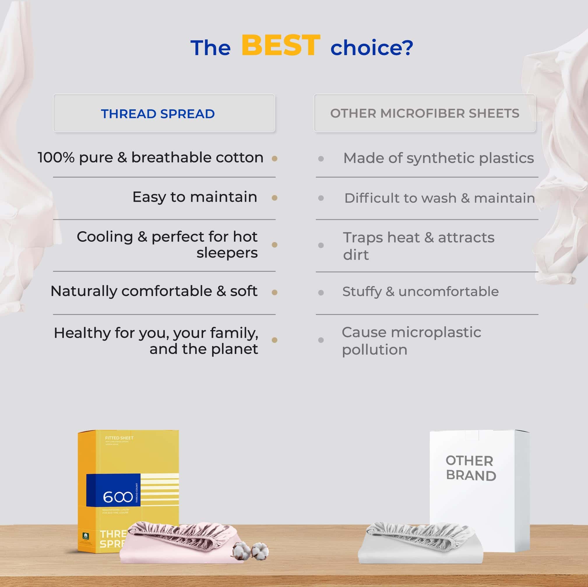 1. ¿Por qué Comprar Thread Spread 100% Algodón en Lugar de Microfibra: Nuestras sábanas ajustables de 600 hilos están hechas de algodón mercerizado para un brillo aumentado y colores más brillantes y profundos que no se desvanecen ni se agrupan incluso después de varios lavados. Para un sueño saludable, elige nuestra sábana ajustable de tamaño completo 100% algodón que es natural en su formulación, fresca al tacto y transpirable para crear una experiencia de sueño celestial. La microfibra es barata y se utiliza principalmente para la limpieza. Atrae el polvo rápidamente y es dañina para tu piel.