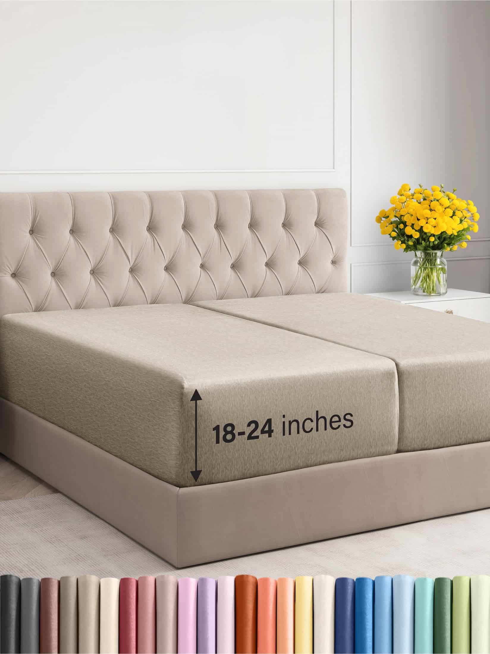 1. OTRAS SÁBANAS SPLIT KING BEIGE JASPEADO A MENUDO SE SUELTAN DEL COLCHÓN mientras duermes y son difíciles de colocar en tu cama, incluso cuando compras la talla correcta. En CGK Unlimited, hemos diseñado nuestras sábanas split king beige jaspeado con bolsillos extra profundos para adaptarse fácilmente a colchones de 18-24 pulgadas de profundidad, por lo que es muy fácil colocarlas en la cama, ¡incluso con un cubrecolchón! Nuestras sábanas split king ajustables profundas también cuentan con elástico en todos sus bordes para abrazar tu colchón de forma segura!