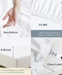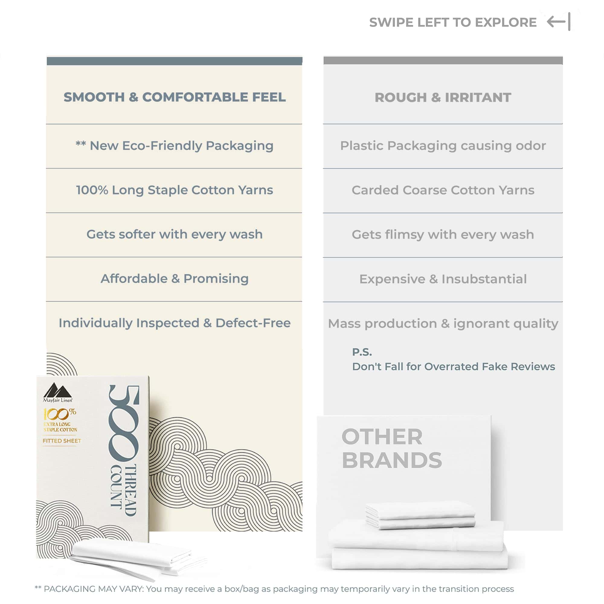 2. Sábana Ajustable que no se Salta: Nuestra Sábana Ajustable King se ajusta perfectamente a cualquier colchón que tengas en casa. Con elástico premium alrededor y bolsillos profundos, nuestra sábana ajustable king size abraza el colchón para que no se deslice, se mueva, se amontone o se salga durante la noche. Incluye solo 1 sábana ajustable king de 78″ de ancho x 80″ de largo que se adapta tanto a colchones bajos como altos que tengan entre 8 y 16″ de profundidad. 3. Lujosamente Suave y Cómodo: Nuestra sábana de 500 hilos está hecha con algodón 100% de fibra larga cultivado en la India. Nuestra sábana ajustable king de algodón es más suave que otras que dicen ser ultra suaves. Observa cómo tu estrés se disipa al deslizarte entre estas sábanas 100% algodón frescas, suaves y transpirables. Nuestras sábanas ajustables king size de bolsillo profundo son excepcionalmente fuertes y duraderas. 4. Lavado es muy Fácil: El algodón es un material duradero y natural y, si se cuida correctamente, puede durar por muchos años. Nuestra ropa de cama king está hecha con un tinte ecológico premium que no se desvanece, por lo que puedes contar con que durarán y durarán. Lava nuestras sábanas 100% algodón en la lavadora con agua tibia/caliente en un ciclo suave. Se puede secar en línea o en secadora, y dobla nuestra sábana king ajustable después de quitarla de la secadora para evitar arrugas. 5. Nos Importa en Mayfair Linen: Si no estás satisfecho con la compra, puedes cambiar o solicitar un reembolso de nuestras sábanas king de bolsillo profundo dentro de los 30 días posteriores a la compra según las políticas de MercadoLibre. Combina nuestras sábanas y fundas de almohada con un edredón y una funda nórdica para completar el aspecto de tu dormitorio. Regala estas sábanas de algodón para cama king a tus seres queridos en el día de la madre, del padre, navidad, san valentin, halloween, bodas, vacaciones y días festivos de otoño y hazles el día.