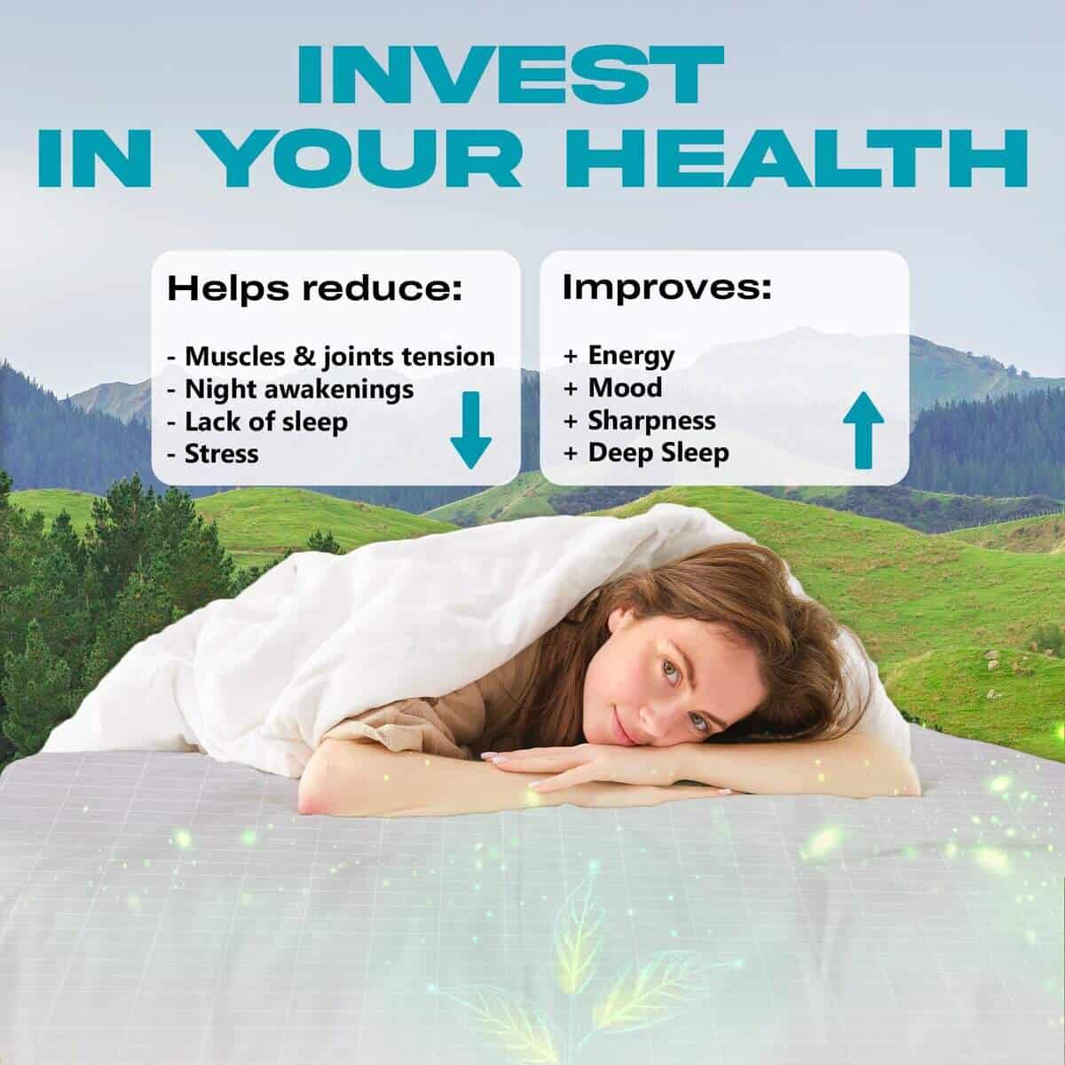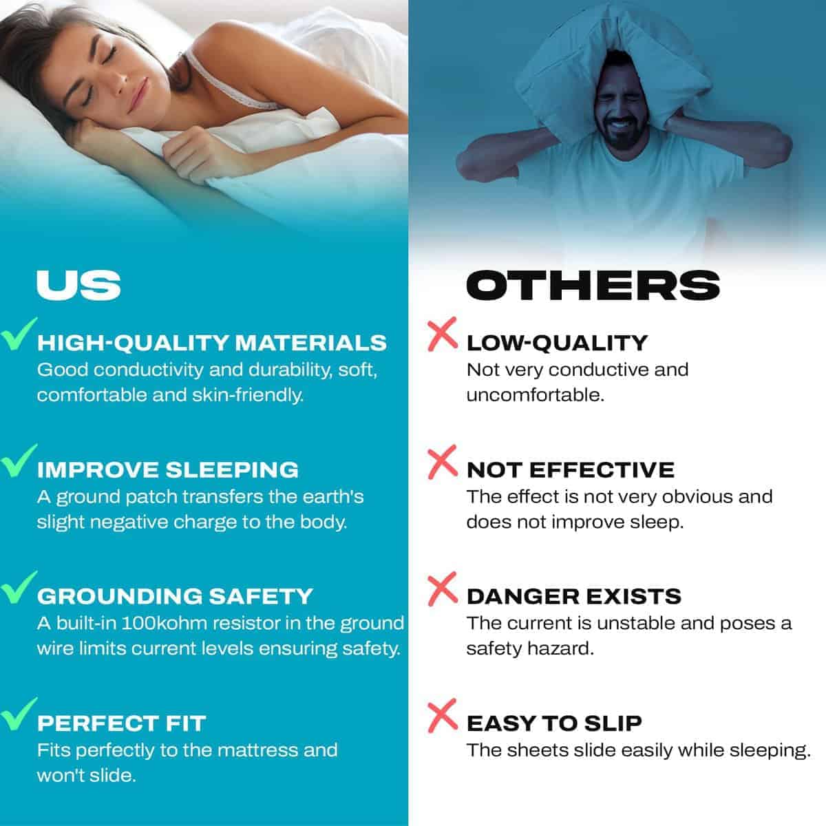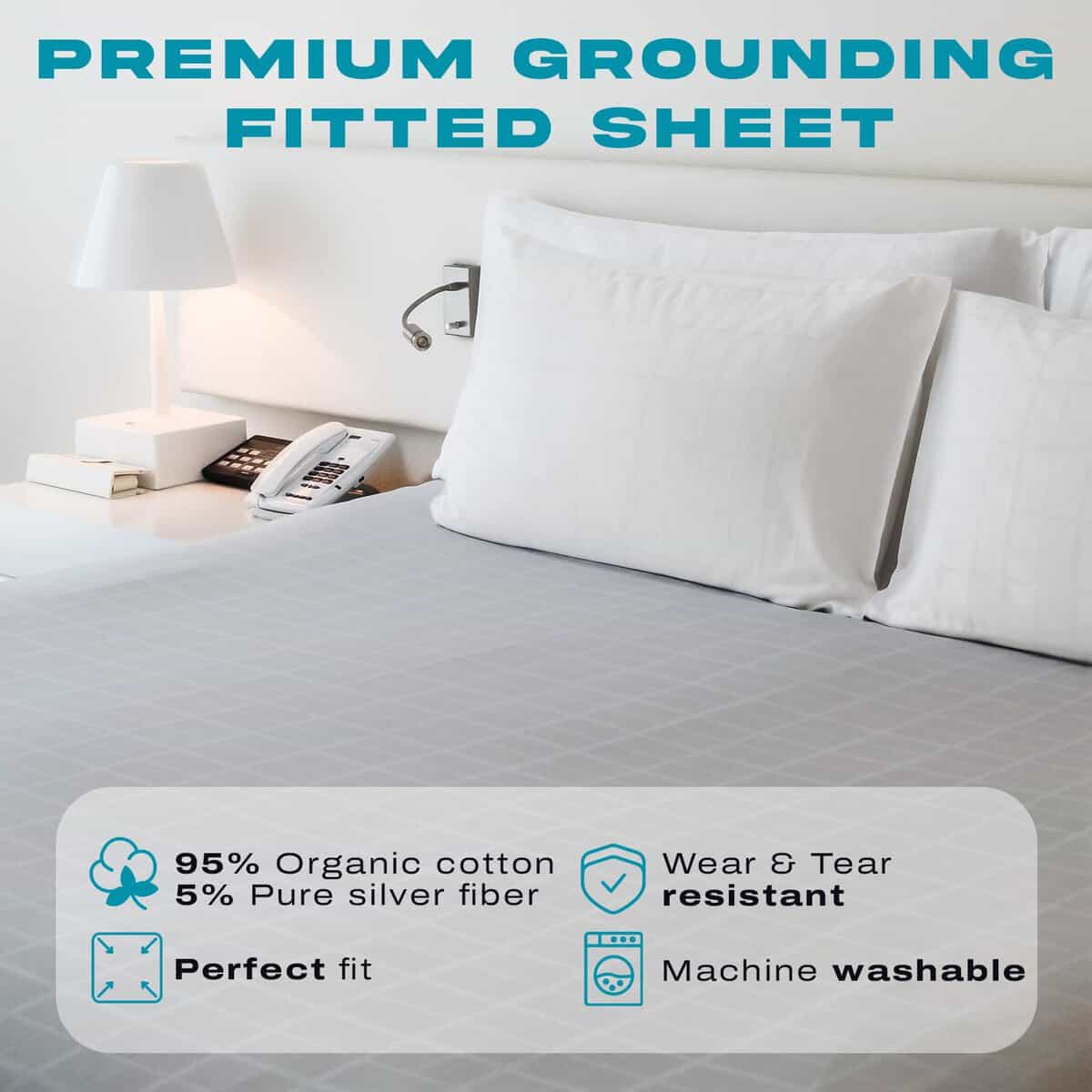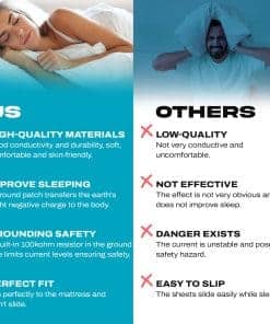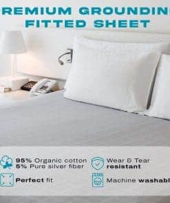 1. SUEÑO MÁS PROFUNDO Y REPARADOR: Las sábanas de conexión a tierra pueden ayudar a regular el ciclo natural de sueño-vigilia de su cuerpo, lo que conduce a una mejor calidad del sueño y a la reducción del insomnio. Usar sábanas conectadas a tierra para descansar también puede ayudar a reducir la inflamación crónica y el dolor estimulando la circulación sanguínea en todo el cuerpo. 2. SUAVE Y CÓMODO: Hechas de una mezcla de algodón natural de calidad para bebé y fibras de plata conductoras, estas sábanas de conexión a tierra son suaves y suaves en su piel. Para mejorar su eficiencia, nuestras sábanas de conexión a tierra están diseñadas para maximizar el área de contacto entre su piel y las fibras conductoras. 3. SEGURO Y FÁCIL DE USAR: Simplemente conecte el cable de conexión a tierra incluido a la sábana ajustable y a un enchufe de conexión a tierra y estará listo para tener una buena noche de sueño. Además, nuestros cables de conexión a tierra están equipados con una resistencia incorporada de 100 k para garantizar su protección. 4. AJUSTE PERFECTO PARA UNA ESTANCIA IDEAL: Disponibles en dos tamaños (Queen y King) para adaptarse perfectamente a su colchón, con esquinas elásticas que mantienen la sábana en su lugar toda la noche. Estas sábanas de conexión a tierra de alta calidad en tamaño queen están hechas para durar, brindándole años de beneficios de conexión a tierra. 5. MARCA DE CONFIANZA Y SÓLIDA GARANTÍA: Los productos de conexión a tierra son una gran inversión para su sueño, y probablemente espera que duren mucho tiempo. Es por eso que prestamos especial atención a la fiabilidad y la calidad de nuestras sábanas. Nuestro excepcional servicio al cliente sigue a su disposición las 24 horas del día, los 7 días de la semana.