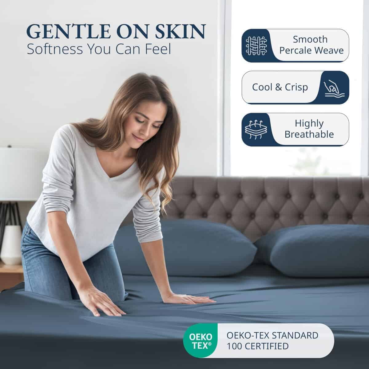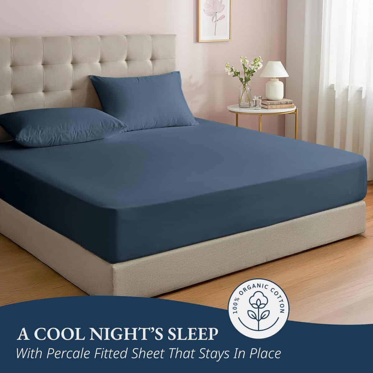 Sumérgete en la durabilidad y suavidad de nuestro tejido percal, elaborado con fibras de algodón orgánico 100%. Este material es suave en tu piel, garantizando una noche de sueño cómoda y acogedora.