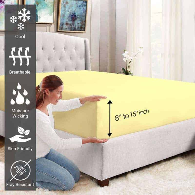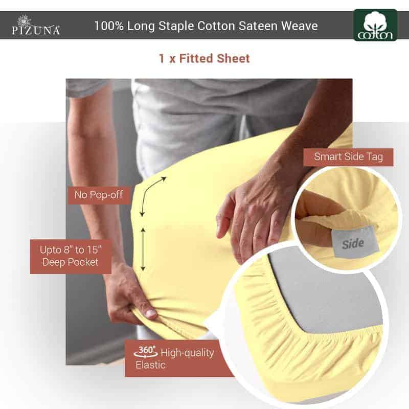 Sábana ajustable Pizuna Pure 100% algodón queen, 400 hilos de satén de algodón de fibra larga bolsillo profundo de 15″ (sábana ajustable queen amarillo suave de algodón) es una excelente opción para una noche de sueño tranquila y fresca. Con etiqueta lateral inteligente en la esquina de la sábana ajustable queen (54 x 75 ) con un bolsillo profundo de 15″, es conveniente de usar y fácil de colocar en el colchón. El patrón de costura patentado asegura un ajuste cómodo y sin costuras en colchones de 8 a 15 de grosor, evitando que las sábanas se salgan por la noche para un sueño ininterrumpido. El algodón mercerizado peinado 100% puro y natural utilizado en esta sábana ajustable de 400 hilos presenta un tejido de satén de una sola trama (4 hacia arriba-1 hacia abajo). El uso de algodón peinado mercerizado hace que estas sábanas sean suaves y resistentes. La ropa de cama de algodón puro y natural se arruga, pero es distintivamente más fresca y transpirable. Además, se suaviza y las arrugas disminuyen con cada lavado. Los productos Pizuna se ajustan individualmente, miden y verifican (pieza por pieza) por nuestro equipo de control de calidad. La tela de esta sábana ajustable queen es certificada por OEKO-TEX y sin AZO (2024), libre de sustancias sintéticas y respetuosa con el planeta, lo que la hace suave incluso para la piel más delicada. Esta sábana ajustable es conforme a BSCI, socialmente responsable y respetuosa con el medio ambiente. El uso de materiales reciclados para el embalaje puede añadir un olor desagradable que desaparece después del primer lavado en agua caliente. Fabricadas con tintes resistentes a la decoloración, son aptas para lavar a máquina en un ciclo suave, secar a baja temperatura. El uso de lejía puede afectar los colores. Diseñadas para un mejor sueño, nuestros expertos en sueño de la casa estudian el comportamiento y patrones de sueño del usuario, lo que resulta en una mejora del producto y un embalaje compacto. Disponible a nivel mundial en múltiples colores y tamaños, convierte a esta sábana ajustable de tamaño queen en la opción de regalo perfecta para tus seres queridos. Pizuna cuida: Miles de familias felices y medios de comunicación han elogiado nuestras lujosas sábanas ajustables. Sin embargo, si no estás satisfecho con el producto, puedes devolverlo dentro de los 30 días según la política, más allá de eso, nuestro equipo de atención al cliente estará allí para ayudarte también.