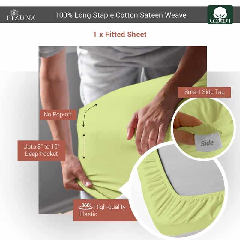 3. 100% Puro y Natural: Con la técnica de hilado fino de Pizuna, esta auténtica sábana ajustable de algodón de 400 hilos cuenta con un tejido satén de cepillado. El uso de algodón de mercería peinado hace que estas sábanas sean suaves y resistentes. La ropa de cama de algodón puro y natural arruga, pero es notablemente más fresca y transpirable. Además, se suaviza y las arrugas se reducen con cada lavado.