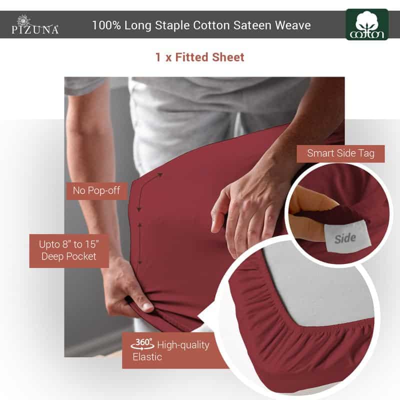 Crafted from 100% Long-Staple Combed Cotton Sateen Weave, this 400 thread count twin xl size fitted sheet with its lightweight texture is made with specially compacted yarn. Minimal artificial processing makes this fitted sheet twin xl size gentle on all skin types, prevents night sweats, absorbs moisture and regulates body temperature to sleep cool while maintaining the elegant hotel look. The smart side tag in twin xl fitted sheet (39 x 80 ) with a 15″ deep pocket is convenient to use and easy for sheet placing on the mattress. The patented stitching pattern ensures a comfortable 360-degree seamless fit on mattresses ranging from 8 to 15 thick, preventing the sheets from popping off at night for an uninterrupted night´s sleep. With Pizuna’s fine yarn technique, this authentic 400 Thread Count combed cotton fitted sheet features a single dent (4 up-1 down) sateen weave. Usage of mercerised combed cotton make these bed sheets smooth & sturdy. Pure & natural cotton bedding wrinkles, but it is distinctively cooler & breathable. Further, it softens and the wrinkling reduces with every wash. Pizuna products are individually tailored, measured and checked (piece by piece) by our Quality Assurance team. The fabric in this fitted sheet twin xl is OEKO-TEX & AZO-Free Certified (2024), free from synthetic substances and planet-friendly, making it soothing even for the most delicate skin. This fitted sheet is BSCI compliant, socially responsible and environment friendly. Use of recycled materials for packaging may add an unpleasant odour which vanishes after the 1st wash in warm water. Made from Fade Resistant Dye, it is machine washable on a gentle cycle, tumble dry low. Using bleach may affect colours. Our in-house sleep experts study the user´s sleep behaviour and patterns, resulting in product enhancement and compact packaging. Available globally in multiple colours and sizes, makes this twin xl size fitted sheet the perfect gifting option for your loved ones. Thousands of happy families and media outlets have praised our luxurious fitted sheets. However, if you’re unhappy with the product, you can return it within 30 days as per the policy, beyond that our customer care team will be there to assist you as well.