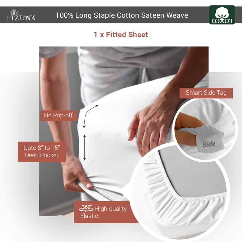Crafted from 100% Long-Staple Combed Cotton Sateen Weave, this 400 thread count fitted sheet king size with its lightweight texture is made with specially compacted yarn. Minimal artificial processing makes this king fitted sheet gentle on all skin types, prevents night sweats, absorbs moisture and regulates body temperature to sleep cool while maintaining the elegant hotel look. The smart side tag in king size fitted sheet (78 x 80 inches) with a 15-inch deep pocket is convenient to use and easy for sheet placing on the mattress. The patented stitching pattern ensures a comfortable 360-degree seamless fit on mattresses ranging from 8 to 15 inches thick, preventing the sheets from popping off at night for an uninterrupted night’s sleep. With Pizuna’s fine yarn technique, this authentic 400 Thread Count combed cotton fitted sheet features a single dent (4 up-1 down) sateen weave. Usage of mercerised combed cotton make these bed sheets smooth & sturdy. Pure & natural cotton bedding wrinkles, but it is distinctively cooler & breathable. Further, it softens and the wrinkling reduces with every wash. Pizuna products are individually tailored, measured and checked (piece by piece) by our Quality Assurance team. The fabric in this fitted sheet king is OEKO-TEX & AZO-Free Certified (2024), free from synthetic substances and planet-friendly, making it soothing even for the most delicate skin. This fitted sheet is BSCI compliant, socially responsible and environment friendly. Use of recycled materials for packaging may add an unpleasant odour which vanishes after the 1st wash in warm water. Made from Fade Resistant Dye, it is machine washable on a gentle cycle, tumble dry low. Using bleach may affect colours. Our in-house sleep experts study the user’s sleep behaviour and patterns, resulting in product enhancement and compact packaging. Available globally in multiple colours and sizes, makes this fitted sheet king size the perfect gifting option for your loved ones. Thousands of happy families and media outlets have praised our luxurious fitted sheets. However, if you’re unhappy with the product, you can return it within 30 days as per the policy, beyond that our customer care team will be there to assist you as well.