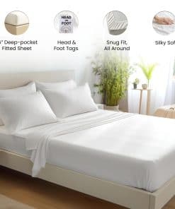 3. Ajuste perfecto con bolsillos profundos: Nuestras sábanas ajustables queen miden 60″ de ancho x 80″ de largo. Esta sábana ajustable queen cuenta con una correa elástica de 360 grados con bolsillo profundo de 16 pulgadas, garantizando un ajuste perfecto y ceñido en tu colchón queen. No más deslizamientos o arrugas, solo un ajuste suave y seguro de sábanas ajustables queen profundas, haciéndolas la sábana ajustable blanca queen ideal para una noche de sueño tranquila.