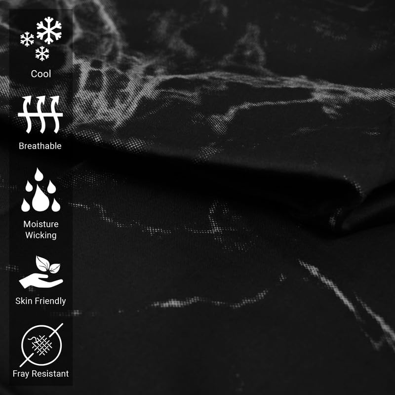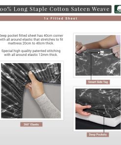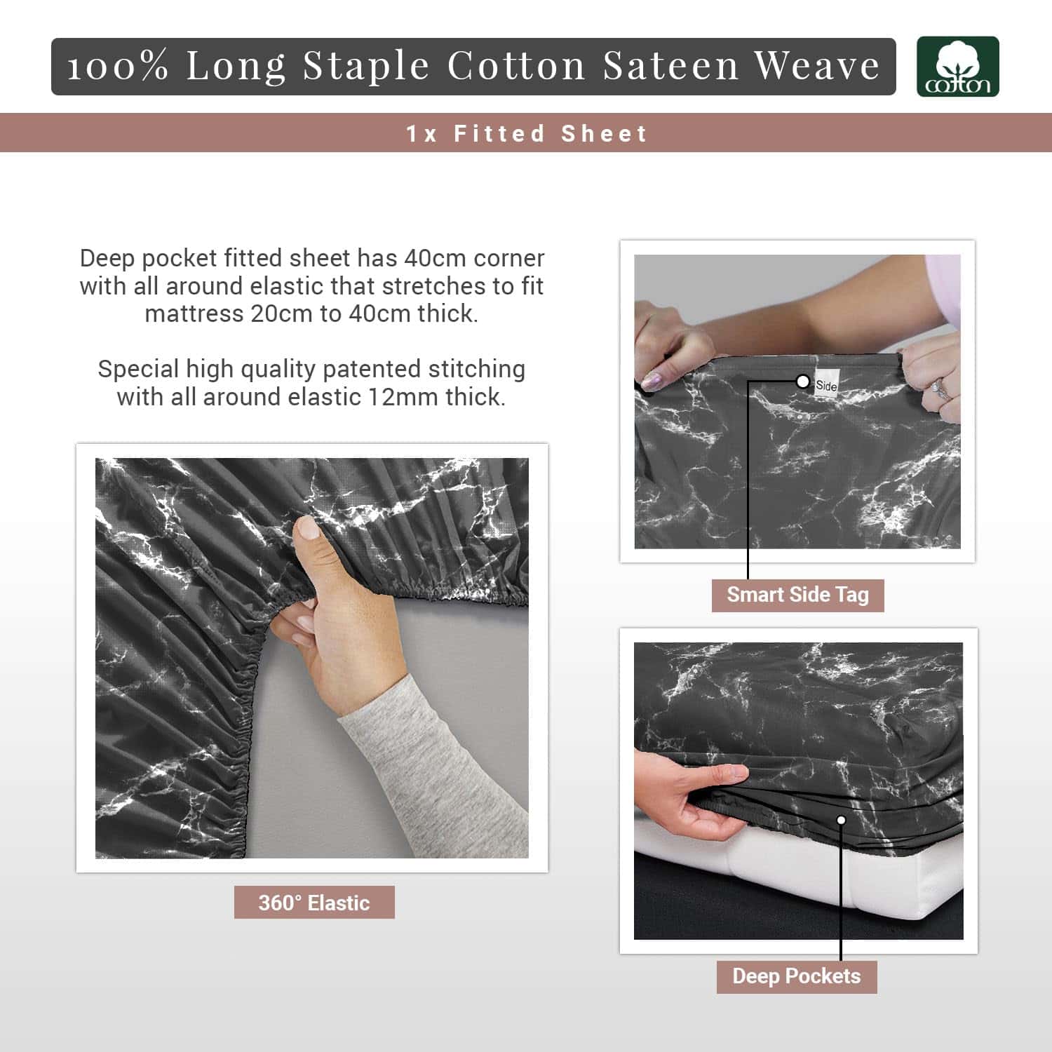 Sábana Ajustable Queen Pizuna Pure 100% Algodón, 400 Hilos de Algodón de Fibra Larga Tejido Satén con Bolsillo Profundo de 15″ (Sábana Ajustable de Algodón Negro Mármol para Queen):