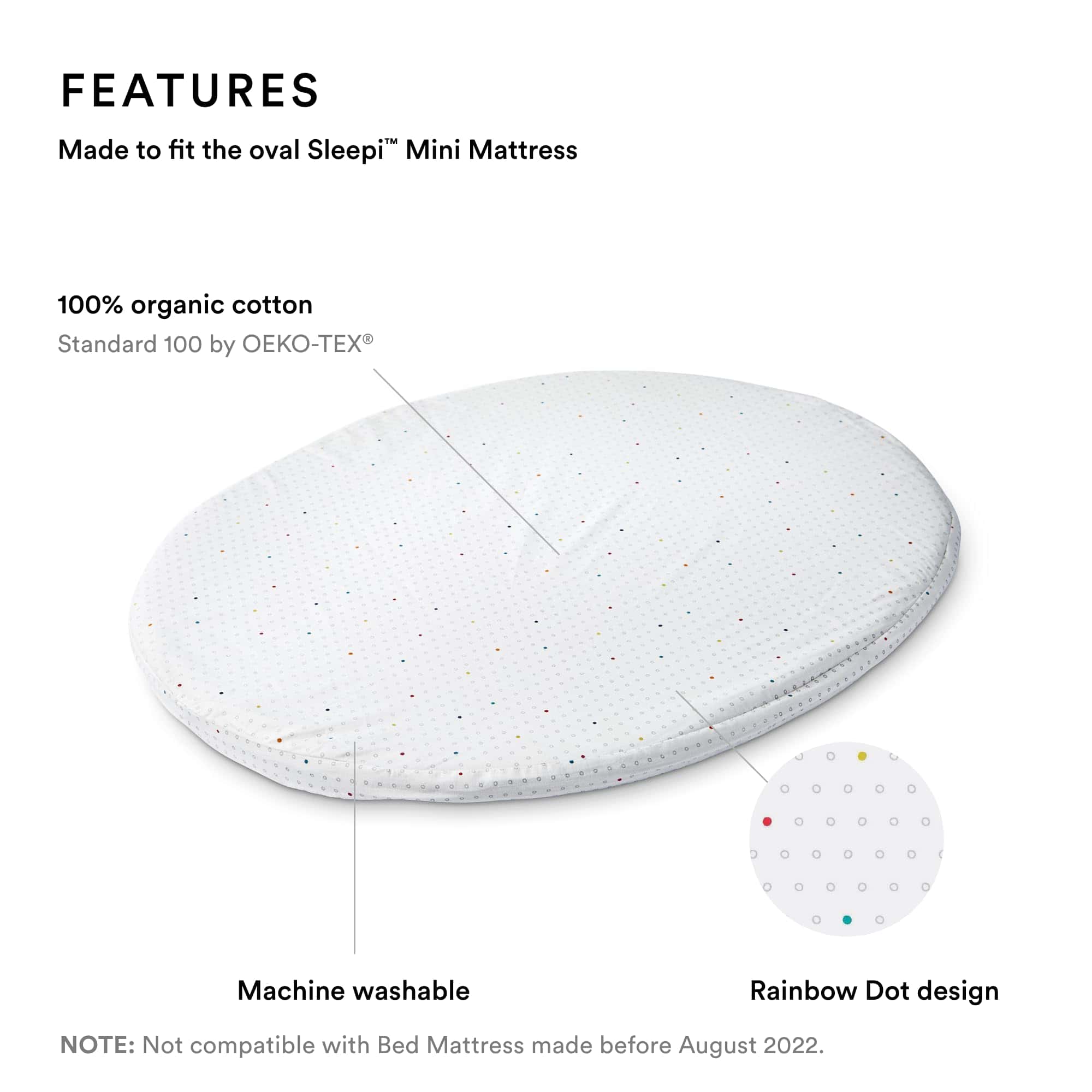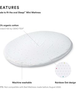 2. COMPATIBILIDAD – Esta sábana ajustable V2 está hecha para encajar en el colchón ovalado Sleepi Mini, No compatible con Colchones Mini fabricados antes de agosto de 2022.