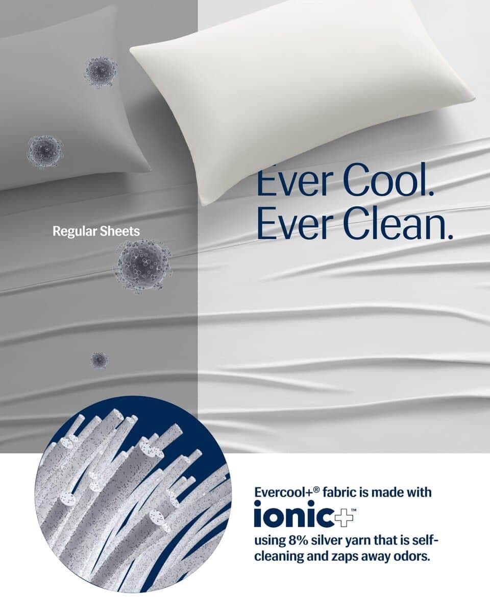 3. Tecnología de Tejido Autolimpiante: Sábana higiénica para pieles sensibles; Con la tecnología de hilo de plata Ionic+ de Noble, los iones de plata con carga positiva están permanentemente incrustados en la fibra Evercool+; La sábana es autolimpiante para inhibir y eliminar eficazmente el olor.