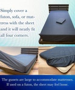 Sábanas ajustadas 100% algodón originales de FULI – Disfruta del toque suave único del algodón. Esta es una elegante cubierta de cama fabricada con la excelente tecnología de teñido y costura de Japón. Las cubiertas de colchón japonesas están diseñadas para brindar una noche de sueño confortable. El algodón es un material muy adecuado para el clima japonés, donde hay grandes variaciones entre las cuatro estaciones. La primavera y el otoño experimentan intensas variaciones en la humedad, las noches de verano son tan calurosas como en climas tropicales, y los fríos inviernos se caracterizan por intensas nevadas. Por eso, los colchones y cubiertas japoneses, incluidos nuestros productos, están diseñados para ayudarte a mantenerte fresco en verano y cálido en primavera y otoño. Las sábanas ajustadas son fáciles de quitar. La sábana está revestida con goma sintética alrededor del borde de su parte inferior, lo que la sujeta firmemente al colchón. Simplemente cubre un futón, sofá o colchón con la sábana y se ajustará perfectamente a los cuatro extremos. Estas sábanas fueron cuidadosamente diseñadas para minimizar el desplazamiento, incluso durante toda la noche. Los fuelles son grandes para adaptarse a los colchones. Si se usa en un futón, la sábana puede sentirse suelta. Adecuado para uso en todas las estaciones. Hechas de algodón, estas sábanas son altamente absorbentes y transpirables, manteniéndote fresco en verano, cálido en invierno y ayudándote a dormir cómodamente durante todo el año. Se siente bien en la piel y puede utilizarse en cualquier temporada. Tamaño: Full / Tamaño del producto: 57″ x 75″ x 12″ / Tamaño de embalaje: 12.3″ x 9.5″ x 1.6″ / Peso de envío: 1.7 lbs. / Cuenta de hilos: 205. Excelentes propiedades térmicas. El algodón contiene mucho aire entre sus fibras. Sus fibras huecas y naturalmente retorcidas forman muchas capas superpuestas, creando bolsillos de aire que resultan en una sábana suave y cálida. Comodidad y sensación agradables. Como fibra natural, el algodón tiene un pH ligeramente ácido, cercano al de la piel humana. Por lo tanto, no irrita la piel de los bebés o de las personas con piel sensible, y tiene una agradable elasticidad y una sensación cómoda. Durabilidad característica del algodón. Después de lavar la sábana, el secado al sol eliminará la humedad y provocará que las fibras se encojan. Esto restaura el volumen original de la sábana, permitiéndote disfrutar del calor del algodón durante un largo período de tiempo. Recomendamos que las personas con alergias al látex eviten usar este producto. Lavable. Nuestras sábanas ajustadas son totalmente lavables a máquina. Los lavados repetidos no suelen causar daños, y de hecho hacen que el tejido sea más suave y aún más amable con la piel. Por favor, evita el secado en secadora, ya que esto provocará encogimiento.