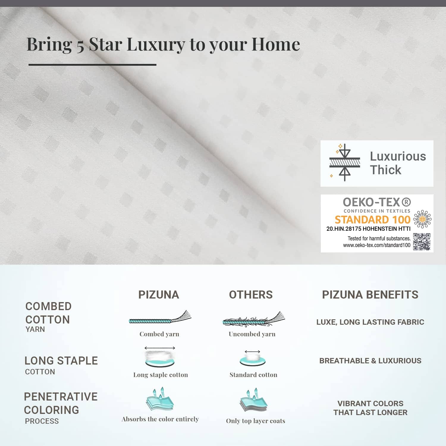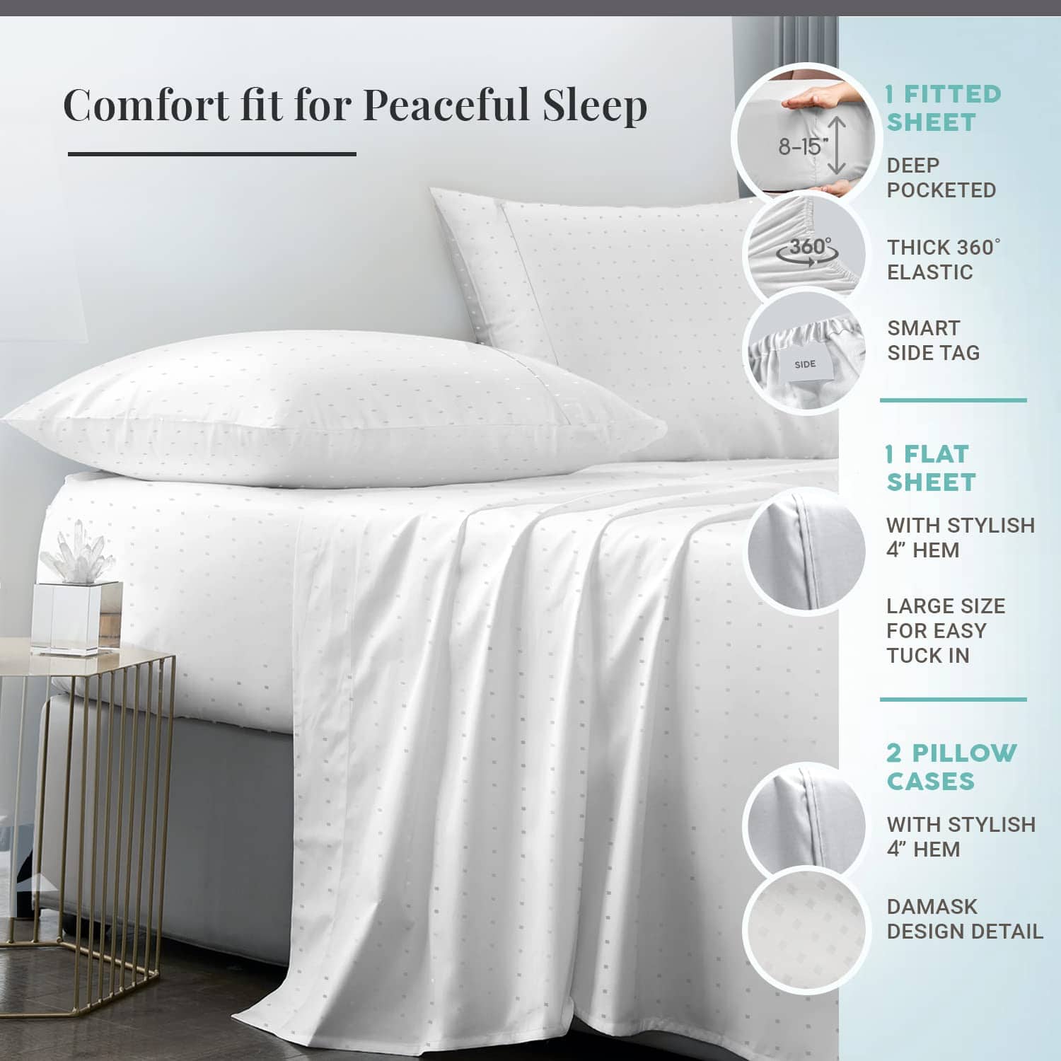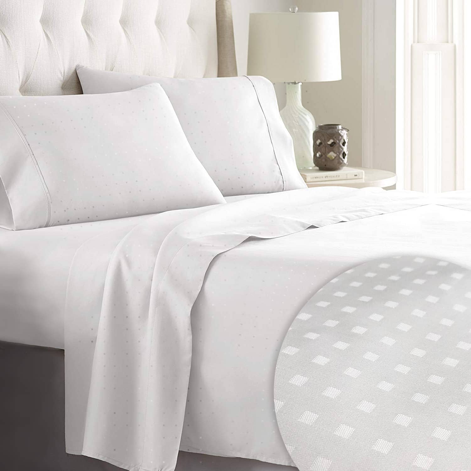 Estas sábanas de algodón puro 100% tamaño King de Pizuna cuentan con 600 hilos de algodón de fibra larga. Fabricadas con sábana de seda de algodón de sarga fresca, estas sábanas ofrecen un ajuste suave y cómodo en su cama. El bolsillo profundo de 15 pulgadas asegura un ajuste perfecto para colchones más gruesos. El diseño de rayas damasco blanco añade un toque de elegancia a su dormitorio. Renueve su ropa de cama con estas sábanas de alta calidad de Pizuna.