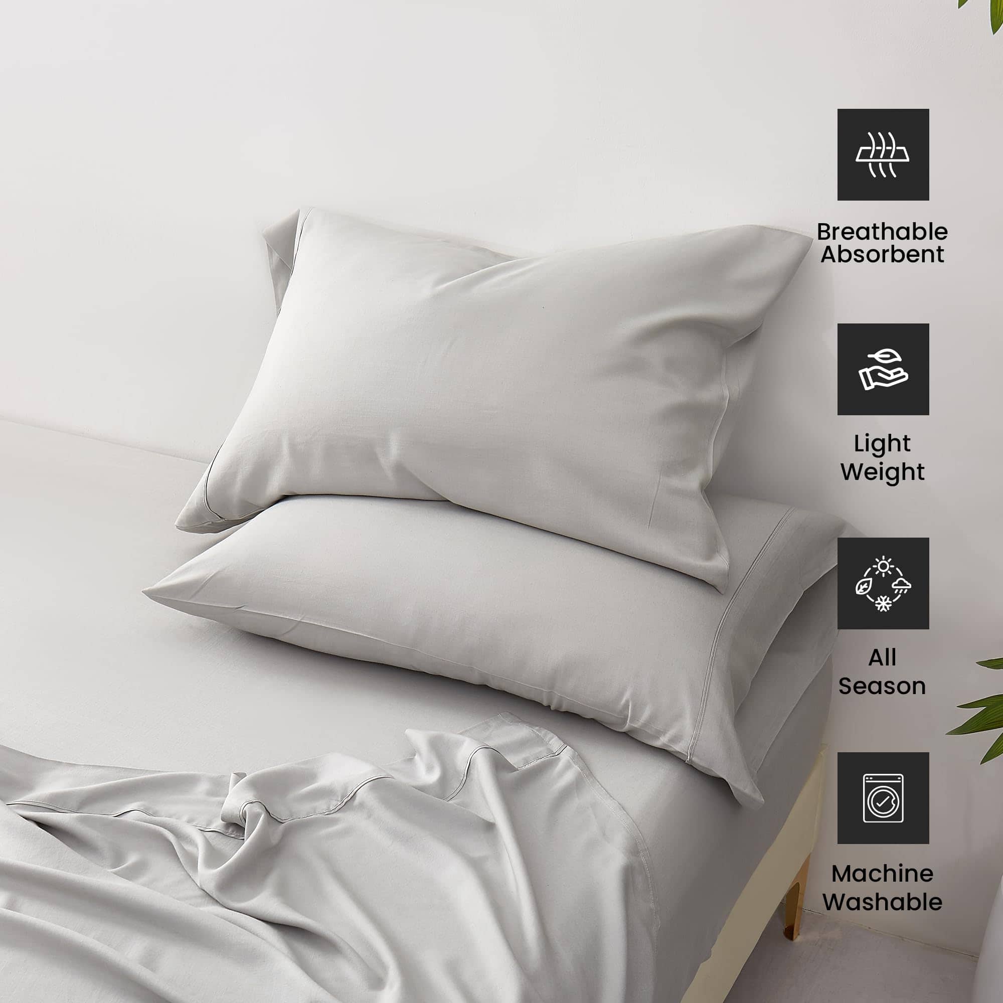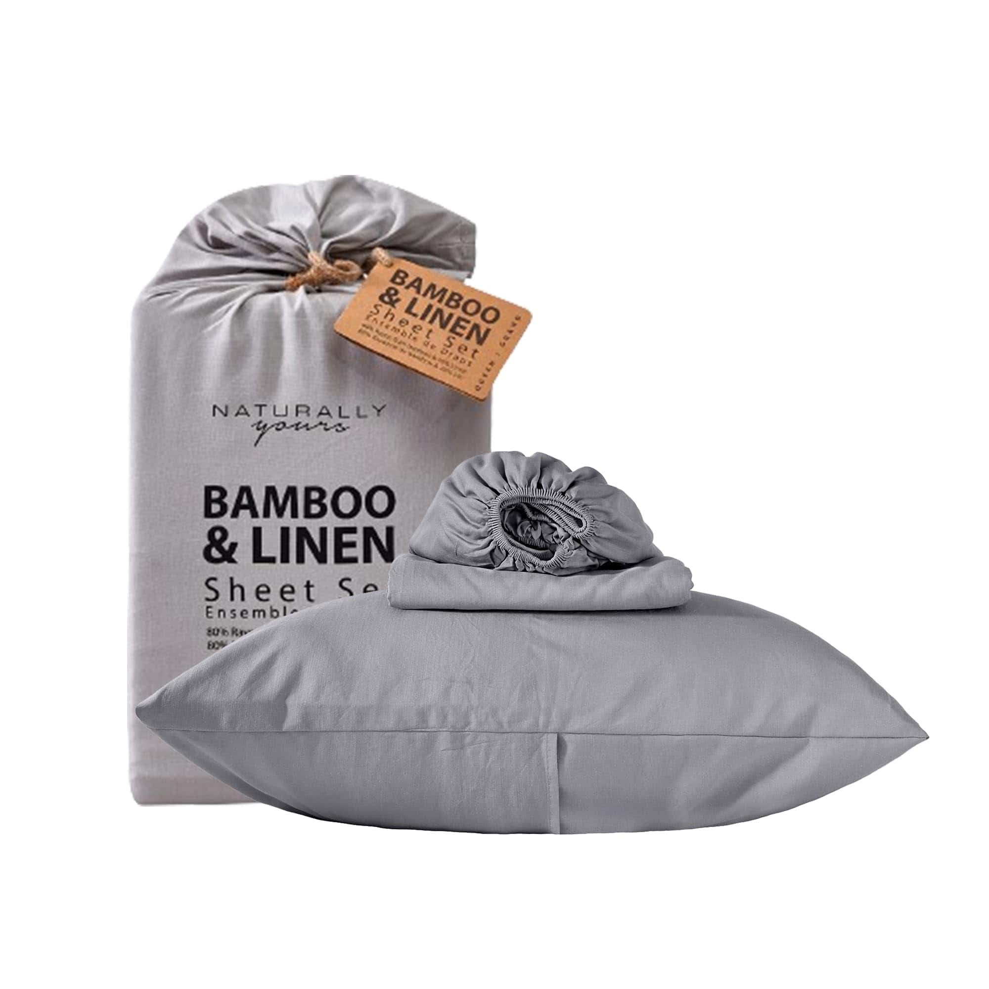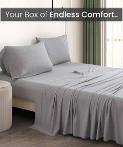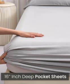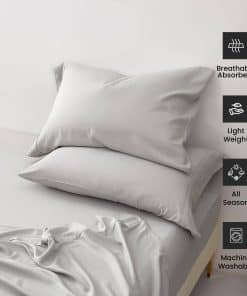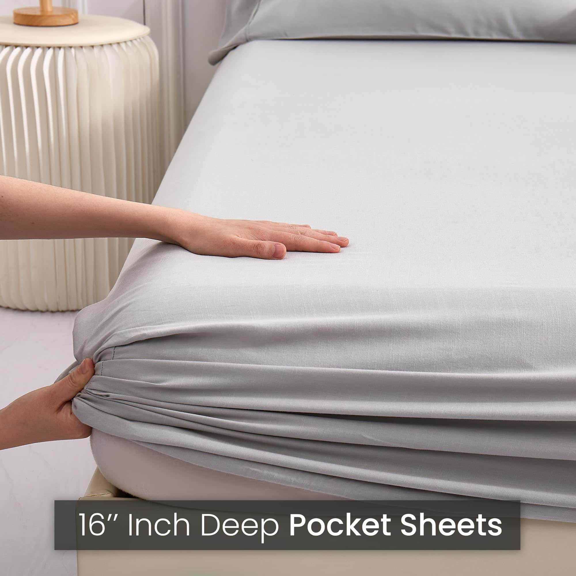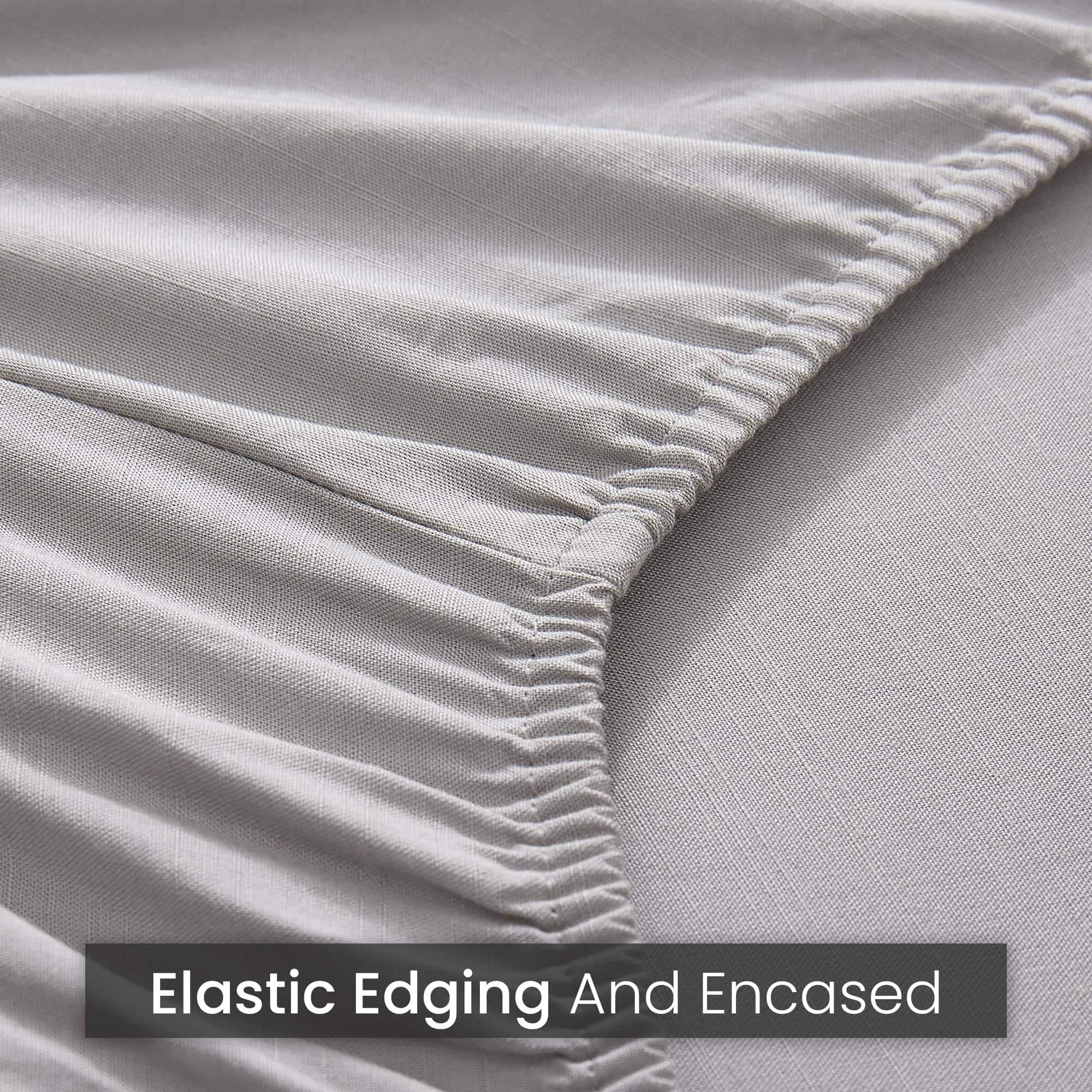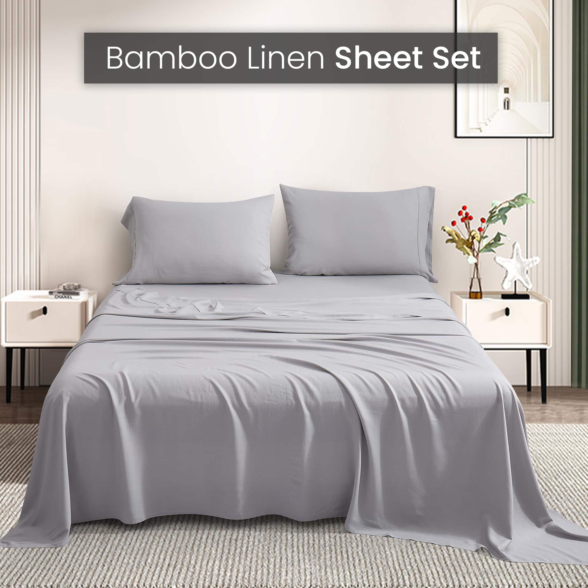 Sábanas de bambú y lino de la nueva temporada en tamaño Queen. Este juego de 4 piezas incluye una sábana ajustable con bolsillo profundo de 15″, una sábana plana y 2 fundas de almohada. Fabricadas con un 80% de rayón y un 20% de lino, estas sábanas son suaves, cómodas y perfectas para cualquier temporada.