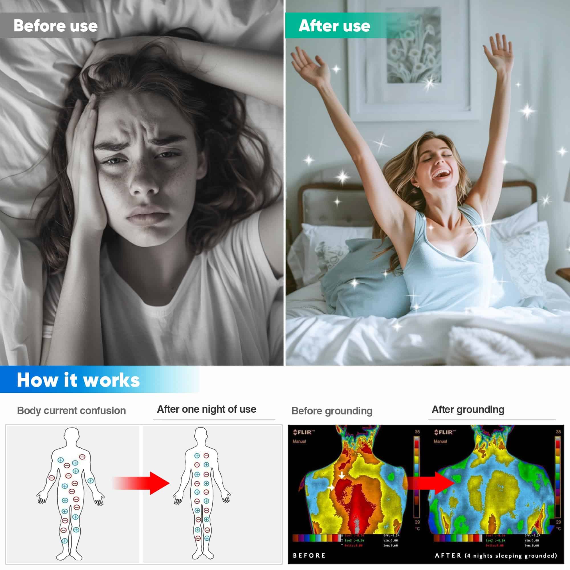 Para conectar a tierra las sábanas, simplemente conecte el cable de tierra al conector metálico en la sábana y enchúfelo en un tomacorriente estándar. Haga que su piel entre en contacto directo con la sábana para mejorar la energía, la calidad del sueño y aliviar el estrés y el dolor. Este producto es adecuado para personas de todas las edades, incluidas mujeres embarazadas y bebés.