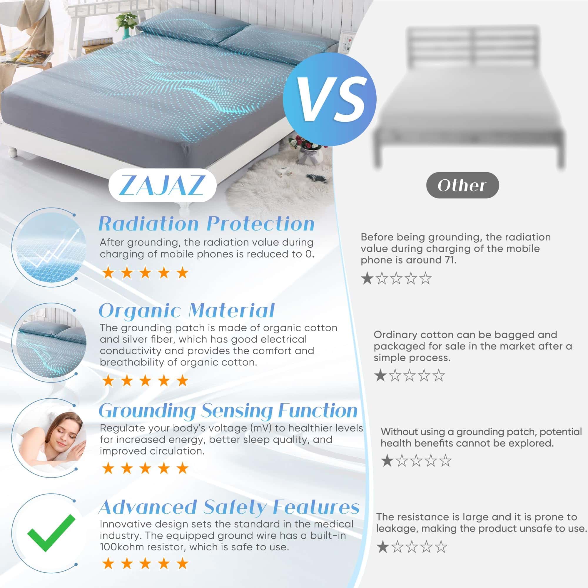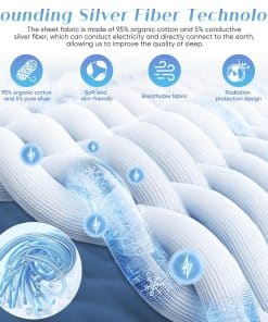 1. Algodón. 2. Nota: El bolígrafo de prueba solo se utiliza para verificar si el producto contiene fibras de plata, y no para verificar si el cable a tierra ha sido conectado. ¡Incluso sin conectar el cable a tierra, la luz trasera del bolígrafo de prueba se enciende, lo que demuestra que nuestro producto contiene fibras de plata conductivas!. 3. MATERIAL DE ALTA CALIDAD: La sábana de tierra está hecha de 95% algodón orgánico + 5% fibra de plata pura, que tiene buena conductividad, es muy cómoda, suave y de alta calidad, brindando la comodidad y transpirabilidad del algodón orgánico, para usted. Brinda comodidad y salud, y mejora la calidad del sueño. 4. FÁCIL DE USAR: Coloque la sábana de cable a tierra en la cama, enganche el cable a tierra en el perno metálico de las sábanas de cama a tierra y luego enchufe el otro extremo del cable de tierra directamente en el puerto de tierra del tomacorriente de la pared. La sábana ajustada a tierra te conecta a los electrones de la tierra y regula naturalmente el voltaje corporal (mV) a un nivel más saludable, aumenta la energía, mejora la circulación, mejora la calidad del sueño, reduce el estrés, alivia los dolores de cabeza musculares, la tensión muscular, etc., para todas las edades, adecuado para mujeres embarazadas y bebés. 5. CONSEJOS DE LAVADO Y CUIDADO: Las sábanas conductoras son lavables a máquina. Use agua tibia y detergente líquido para la ropa. Se recomienda lavarlas una vez cada una o dos semanas. La almohadilla de conexión a tierra se puede limpiar con agua jabonosa, un paño no abrasivo o una esponja, y la correa de conexión a tierra se puede lavar a mano con agua tibia. Secar en secadora a baja temperatura o colgar para maximizar la vida útil de su tela de fibra de plata. 6. PRODUCTO SEGURO DE USAR: Utilizado con dispositivos electrónicos como computadoras portátiles, tabletas, teléfonos inteligentes, etc., el producto inteligente de conexión a tierra tiene un dispositivo limitador de corriente con un resistor incorporado de 100 kilohmios para evitar fallas a tierra. La toma a tierra solo se conecta a la tierra y no utiliza ninguna fuente de alimentación, por lo que no necesita abrir el enchufe. Se puede usar una varilla de tierra en lugar de la toma de tierra. (Tenga cuidado de colocar los cables para que no creen enredos o riesgos de tropiezos.). 7. SERVICIO: El paquete contiene 60″x 80″x 13″ sábanas de cama a tierra grises, cable de conexión a tierra de 15 pies y manual.