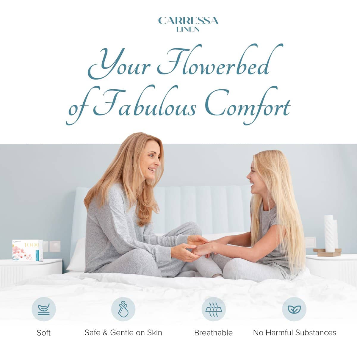 El lujo del hotel, en casa. Deslízate en las indulgentes sábanas de algodón hechas con algodón de fibra larga extra para una textura suave y sedosa. Estas sábanas de algodón egipcio tamaño king tienen un 30% más de grosor y peso para la sensación lujosa y premium del hotel de cinco estrellas en casa. Además de las bondades del algodón egipcio, nuestras sábanas de algodón king size pasan por el proceso de mercerización para mejorar la resistencia y el brillo sedoso, y reducir el encogimiento, el apelotonamiento y la decoloración en el lavado. Nuestro juego de sábanas king size tiene 4 piezas: 1 sábana plana, 1 sábana ajustable y 2 fundas de almohada. Hemos diseñado nuestra sábana ajustable con atención al detalle para que no se salga, especialmente cuando te subes a la cama después de un día largo y agotador. Gracias a los bolsillos extra profundos y al mejor elástico, nuestras sábanas ajustables se envuelven alrededor del colchón de forma ajustada. En Carressa Linen, valoramos el bienestar y la tranquilidad de nuestros clientes. Es por eso que todos nuestros productos están validados por OEKO-TEX para garantizar la ausencia de sustancias nocivas. Además, las sábanas de algodón son realmente buenas para la piel porque están hechas de las fibras naturales de la planta de algodón. Sumérgete en el mundo de los sueños con nuestras sábanas king 1000 hilos diseñadas para relajar, rejuvenecer y recargar tu espíritu.
