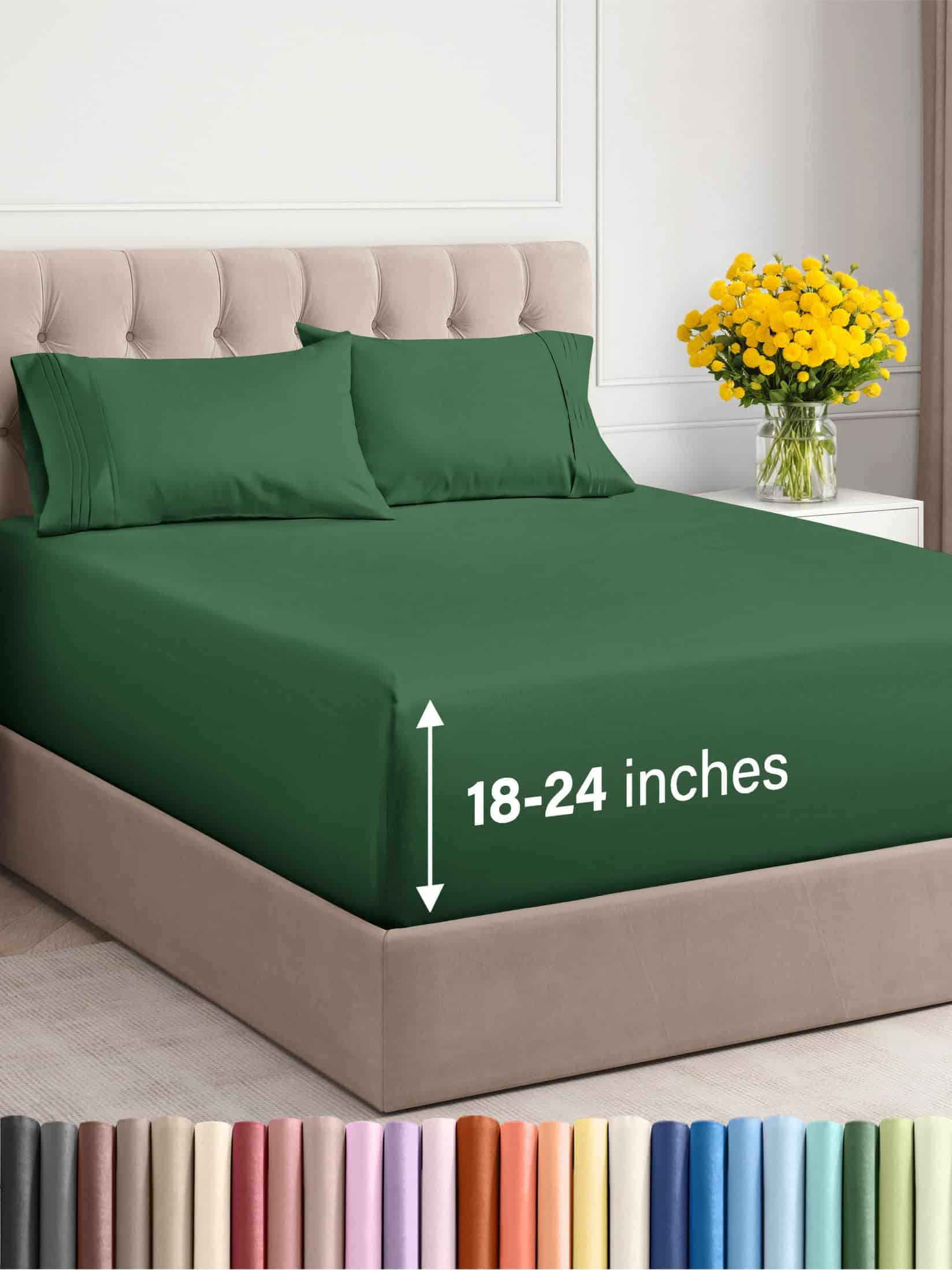 Estas sábanas extra profundas para cama matrimonial en color verde esmeralda son la elección perfecta para aquellos que buscan una experiencia de sueño de lujo. Hechas de microfibra súper suave, estas sábanas son más suaves que el algodón y tienen una sensación ligera que te hará dormir plácidamente toda la noche. El juego de sábanas incluye una sábana plana, una sábana ajustable extra profunda y dos fundas de almohada que cuentan con un elegante diseño de bordado decorativo. Las sábanas son ideales para colchones con topper, ya que tienen bolsillos de 21 pulgadas de profundidad que se ajustan a colchones de hasta 24 pulgadas de grosor. Sin importar si tienes un colchón con cubierta de almohadón, topper de espuma o cualquier otra adición, estas sábanas se mantendrán en su lugar y no se desprenderán. Descansa tranquilo sabiendo que tu cama estará vestida con estas sábanas de lujo que son suaves, sin arrugas y cómodas. Eleva tu experiencia de dormir con estas sábanas extra profundas de color verde esmeralda.