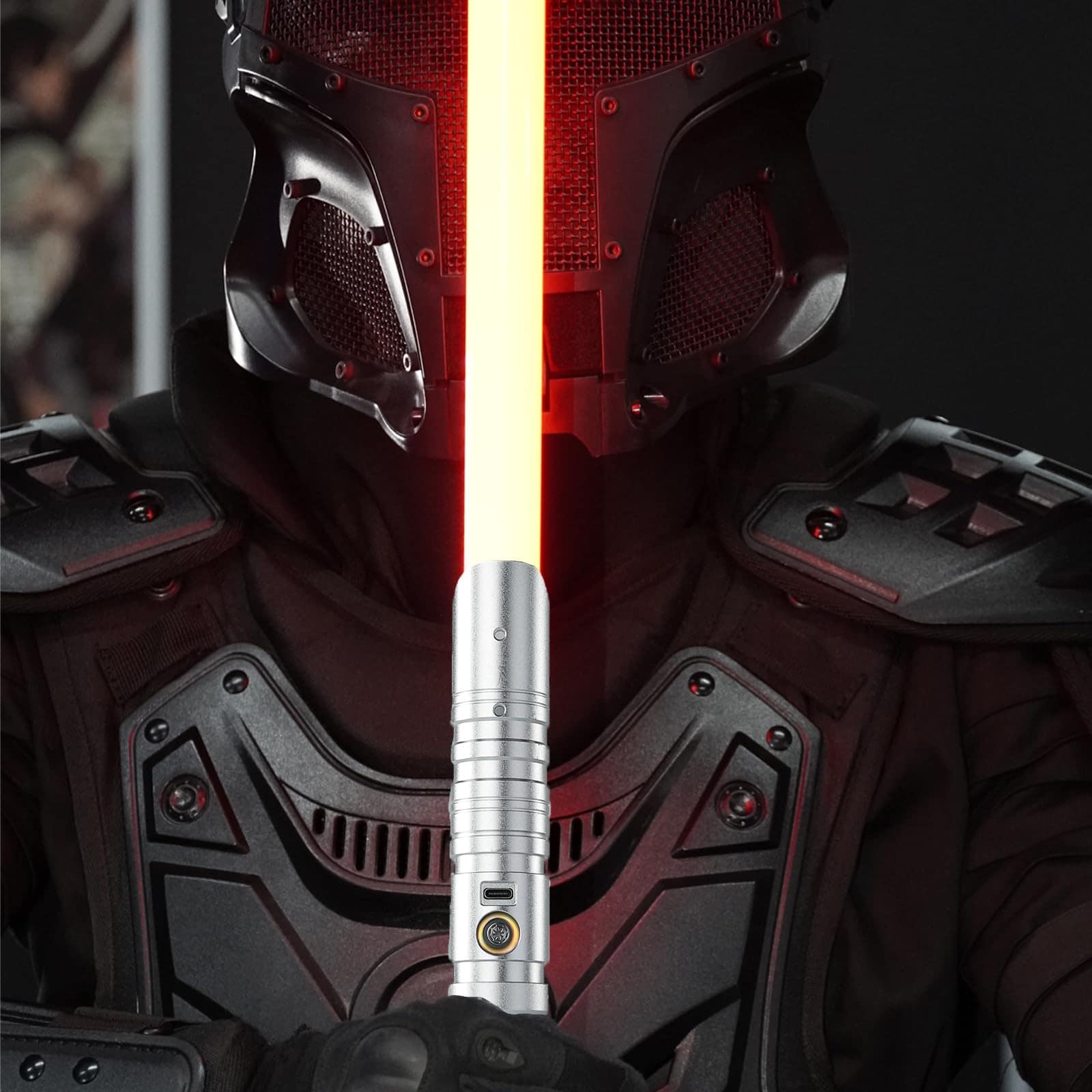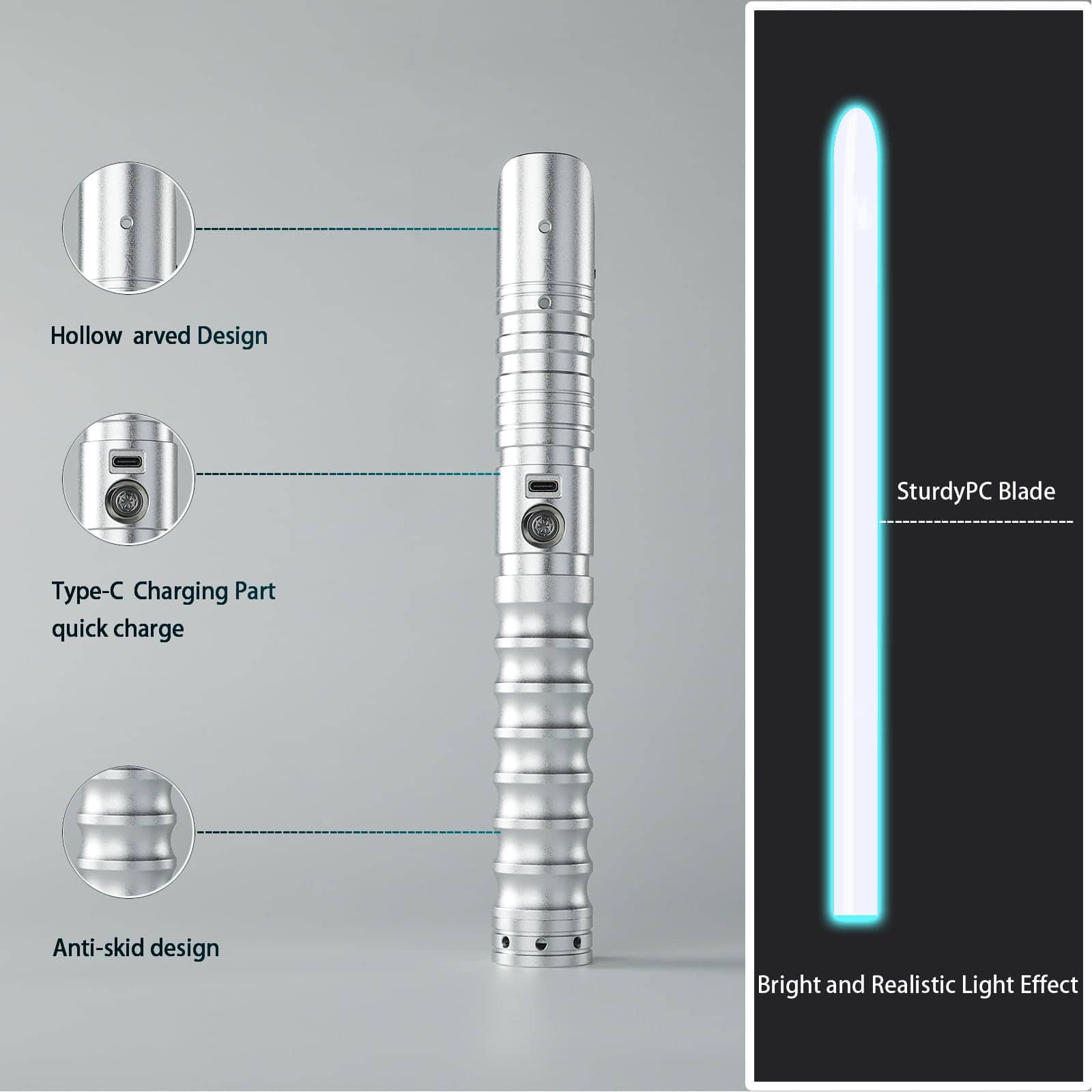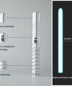 El sable de luz RGB CHINEYDY cuenta con la última vibración mejorada en el mango, efectos de sonido especializados y modo de destello. El mango cómodo y antideslizante está hecho de aluminio metálico, brindando una sensación más realista. La resistente hoja de PC es resistente a dobleces y golpes, soportándote en duelos reales. La cuchilla está hecha de PC, no es fácil de deformar y es resistente a impactos, soporta duelos pesados. Con 4 configuraciones de efectos de sonidos, 3 efectos de luz y 3 ajustes de volumen que se pueden cambiar en cualquier momento, y el sonido se puede apagar. Swing suave y efectos de choque sensibles como un verdadero sable de luz. Batería recargable de gran capacidad integrada de 3000mAh, la batería es extraíble y reemplazable. Adecuado para fiestas de cosplay, deportes al aire libre, entretenimiento familiar, campamentos al aire libre, entrenamientos deportivos de esgrima, ideal para practicar duelos y juegos casuales. El sable de luz RGB bellamente empaquetado con 16 colores y 4 modos de sonido es ideal para fans de películas, niños, adultos como regalo de cumpleaños, Navidad o para cosplay de Halloween. ¡Consíguelo para tu familia, amigos y tú mismo, para luchar juntos!