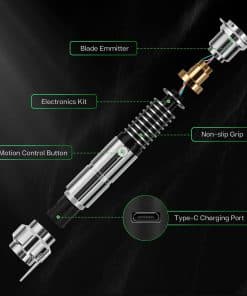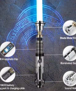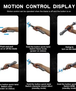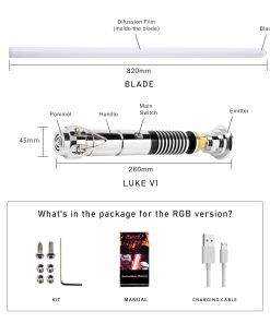 Tiempo de carga Ciclo de carga. Batería recargable y puerto de carga USB-C rápido, Use un cargador de 5V 1A para cargar y tardará 2 horas en cargarse completamente y reproducir 4 horas. Tamaño El mango es de 30 cm y el tamaño de la cuchilla por defecto es de 32 pulgadas. Si se requiere una cuchilla de 36 pulgadas, se debe notificar con antelación o anotar en el pedido. La cuchilla es desmontable. Versión RGB de Baselit Premium, equipada con cuchilla de PC de 32 pulgadas, 16 efectos de sonido, 12 colores de cuchilla preestablecidos, 3 tipos de efectos de cuchilla, batería de 2000mAh de iones de litio. Personalizado con tarjeta SD versión PIXEL, 27 efectos de sonido, 12 colores de cuchilla preestablecidos, 9 tipos de efecto de cuchilla, 11 juegos de efecto de encendido, Personalizable, batería de 3200mAh de iones de litio. Método de operación Modo General 1. Presione brevemente 1 vez —— Abrir espada 2. Toque el botón —— Bláster 3. Mantenga presionado el botón hasta que la luz del botón parpadee una vez —— Bloquear 4. Mantenga presionado el botón hasta que la luz del botón parpadee dos veces —— Cambiar colores 5. Mantenga presionado el botón hasta que la luz del botón parpadee tres veces —— Cambiar modo (Estable, Pulsante, Respiración) 6. Mantenga presionado el botón hasta que la luz del botón parpadee cuatro veces —— Estado de espera 7. Mantenga presionado el botón hasta que la luz del botón parpadee cinco veces —— Control de movimiento encendido 8. Mantenga presionado el botón hasta que la luz del botón parpadee seis veces —— Apagado Modo de control de movimiento 1. Gire el sable —— Encender o apagar la cuchilla 2. Levante la cuchilla y mantenga presionado el botón y luego gire el sable—— Cambiar efectos de sonido del personaje 3. Baje la cuchilla y mantenga presionado el botón y luego gire el sable—— Cambiar BGM (modo de espera) / Cambiar color (estado de encendido) 4. Estado de espera, mantenga presionado el botón hasta que la luz del botón parpadee cuatro veces ——FOC activado