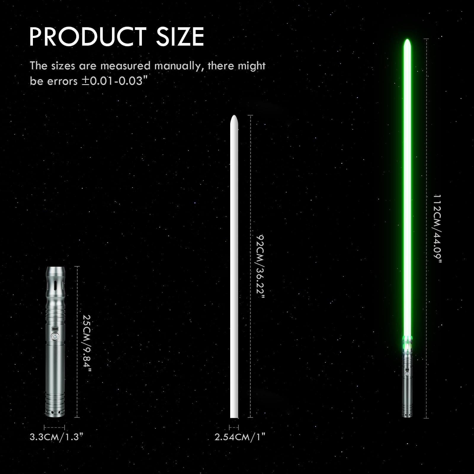 1. Función de APP actualizada: La última placa RGB 3.0 soporta la Función de APP, mostrando estado de la batería/tiempo, volumen, 16 efectos de sonido/luz/color/control de movimiento encendido/apagado, etc. Puedes ajustar todo libremente, como el volumen, fuente, efecto de luz, color, control de movimiento encendido/apagado, etc. La APP está diseñada para hacer que tu juego sea más avanzado, explorar más diversión con el sable de luz. 2. Sable de Luz RGB3.0 Smooth Swing: Función de Control de Movimiento más sensible, te permite encender o apagar la hoja empujando y tirando, girando o balanceando. 16 configuraciones de fuentes de sonido, efectos de sonido de película realistas. Añadida la Función de APP, muestra el estado de la batería/tiempo, ajusta volumen/brillo de la hoja/sensibilidad, selección de fuente de sonido, efecto de luz al bloquear/arrastrar/destello en colisión, cambio infinito de color/selección rápida de color, control de movimiento encendido/apagado, etc. 3. Sable de Luz Metálico para Duelo Pesado: Empuñadura de aleación de aluminio pulida. La empuñadura de metal le da al sable de luz peso sólido, cómodo de sostener, resistente y no es fácil de deformar. Hoja de PC de alta resistencia, longitud de 92 cm, no es fácil de doblar o doblar. Sable de Luz para Duelo Pesado para Adultos. 4. Sable de Luz Perfecto: 16 modos de fuentes de sonido, 3 efectos de luz, 3 ajustes de volumen de sonido sable de luz, Cambio Infinito de Color RGB, Función de APP. Lo mejor para tu familia y amigos, ellos amarán absolutamente este creativo sable de luz. Registra los momentos felices, cosecharás las sorpresas. 5. Servicio Postventa: Si tu sable de luz tiene alguna pregunta, por favor contacta a nuestro servicio al cliente de inmediato. Contamos con un servicio postventa de 12 meses, que ayuda a dar ayuda a tiempo y enviar piezas de repuesto si es necesario. Obtén un sable de luz de metal que te pertenece ahora mismo.