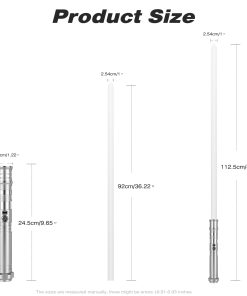 Especificaciones del Producto: Material: Empuñadura de Aleación de Aluminio 6063, Hoja PC Desmontable Tamaño: Empuñadura 24.5cm. Hoja 92cm Diámetro Exterior de la Hoja (OD): 1 pulgada Grosor: 2mm Tiempo de Carga: 8 horas para la primera carga, y luego 4 horas de carga y juego durante 2 horas Voltaje de Carga: 5V (MÁX). Batería: Batería 18650 3.7V 3000mAh Color de la Hoja: Colores Infinitos Sonido de la Película FX Simula el sonido de las películas para que disfrutes de la emoción de la batalla. Hará un sonido diferente cuando tengas diferentes movimientos de combate y golpes. Empuñadura de Aluminio Cuando lo sostienes, te sentirás emocionado por su suave empuñadura de metal. Cuando lo agitas, es como un sable real. Hoja Brillante Cuando enciendes el botón de luz, sentirás un sentido más realista de combate que cambiará a medida que pelees. Hoja de PC de Alta Calidad Y de alta calidad, puede quedarse contigo por mucho tiempo. No debes perderlo por tus errores o locuras. Será el orgullo de todos tus juguetes. Ajuste de Volumen de Sonido 3 niveles de volumen de sonido para elegir, Sonido Fuerte / Sonido Suave / Sin Sonido (silencio). 4 Fuentes de Sonido 4 juegos de fuentes de sonido para elegir, Sable Oscuro / Kylo Ren / Rey / Darth Vader 3 Efectos de Luz 3 tipos de efectos de luz disponibles, Estable / Inestable / Pulso Inclusión del Paquete: 1 x Mango 1 x Hoja 1 x Cable de Carga Tipo-C 1 x Llave Allen 4 x Tornillo 1 x Manual ADVERTENCIA 1. Los niños menores de 13 años siempre deben ser supervisados por un adulto. 2. ¡Solo por diversión! ¡Prohibido la violencia! 3. ¡Usa un cargador de 5V, 1A! 4. Cuando no haya una hoja instalada, no flashes la luz a los ojos.