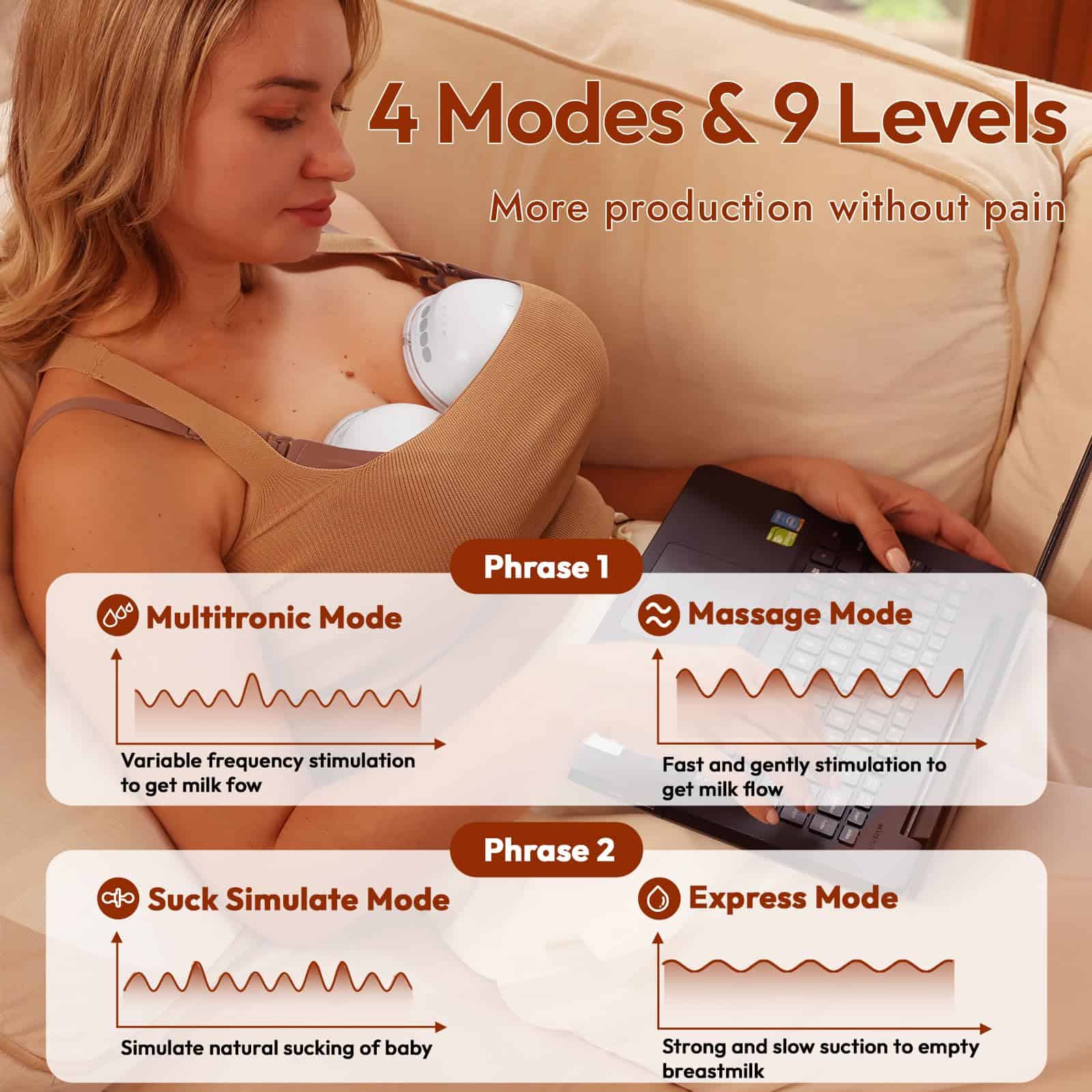2. Eficiencia personalizable: El sacaleches manos libres NCVI 8111 tiene 4 modos de extracción y 9 niveles de succión ajustables para simular el ritmo de succión natural de tu bebé. Puedes personalizar el proceso de extracción para adaptarlo a tu comodidad y necesidades. Logra una extracción eficiente y sin dolor.