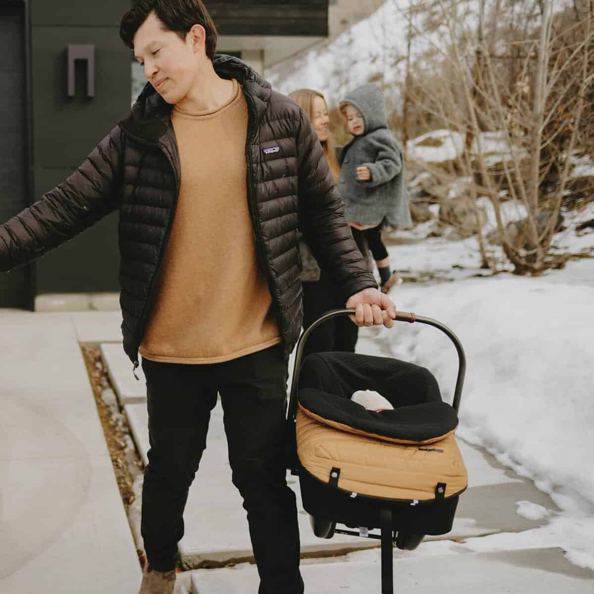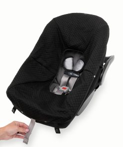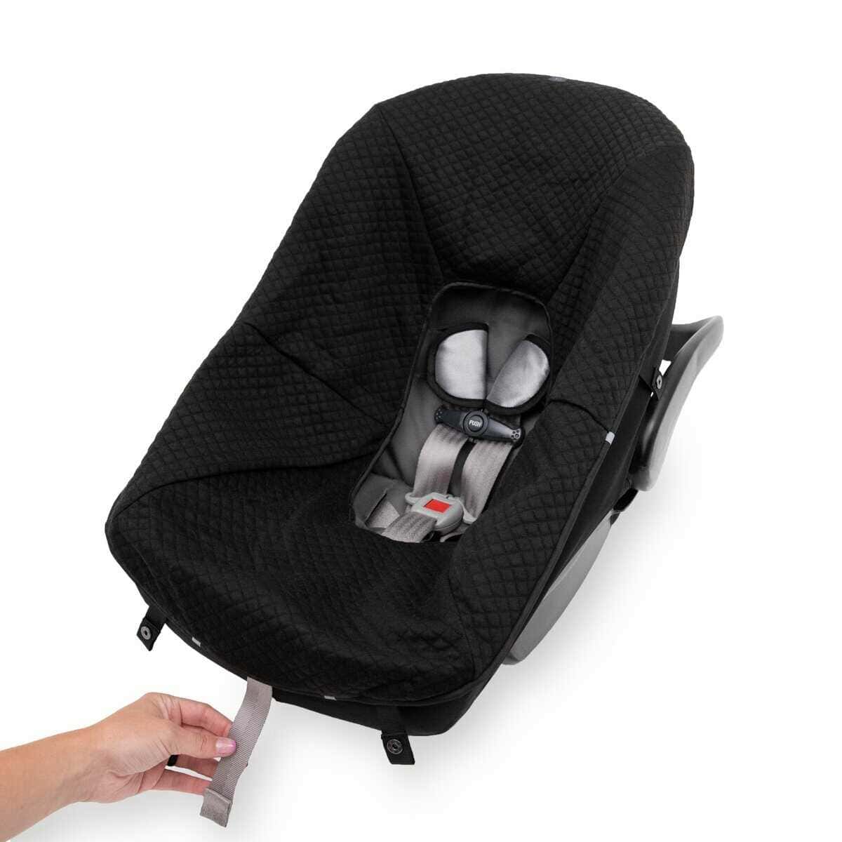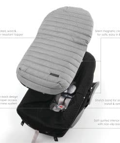 SAFE AND SECURE New and improved interior material! Even softer and won’t ball up or peel. Our footmuff has a unique open back design which offers convenient access to your harness system and reduces the material behind your baby for a safer, more comfortable experience. The stretch fabric creates a universal fit for most car seats and the reflective tabs assist with easy alignment of the topper to the base. Four snap straps provide added security for the topper to the backing.