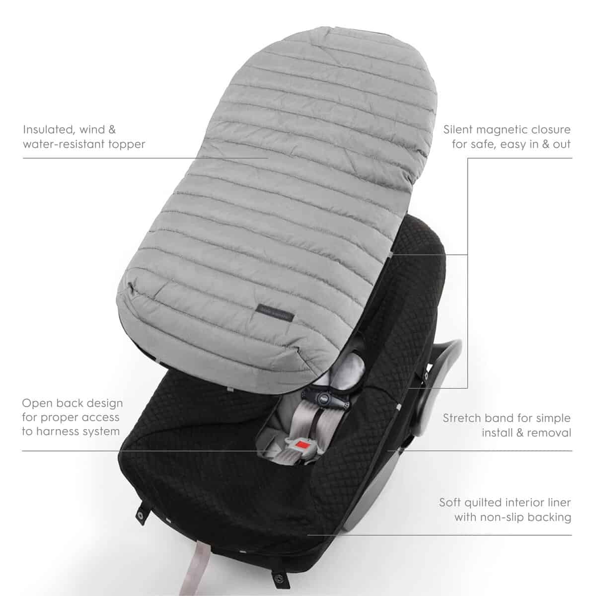 FUSS-FREE Our innovative and silent magnetic closure system allows for trouble-free, quiet check-ins. No more snagging zippers or loose blankets! The stretch fabric allows for easy install on most infant car seats and makes the footmuff simple to take on and off. A drawstring sack for storing the footmuff is included so the cover is compact and easy to take on the go.