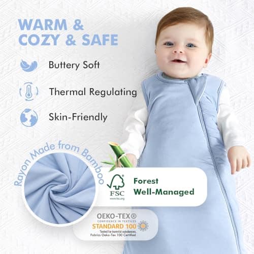Nuestros sacos de dormir están hechos de Bambú Rayón de bosques responsables (certificado FSC), que es suave como la mantequilla, hipoalergénico, regulador térmico, que absorbe la humedad y sostenible, ayudando a mantener a tu bebé cómodo y seco. La cremallera YKK de 2 vías en forma de J se abre completamente o desabrocha la mitad inferior para cambios de pañal más fáciles y secado rápido. Nuestro saco de dormir es lavable a máquina. Amplio espacio para patear y crecer, pero no puede ser pateado. Clasificación TOG de 1.0 para la temporada perfecta durante todo el año. Costuras y acolchado reforzados para mayor durabilidad. Protección en la cremallera para la cara del bebé. Aperturas de brazo y cuello dimensionadas según las últimas investigaciones. Telas seguras probadas contra más de 1,000 sustancias para los máximos estándares. Color unisex que lo hace una gran idea para cada niño pequeño. S para 0-6 meses, M para 6-18 meses, L para 18-36 meses (2t – 3t).