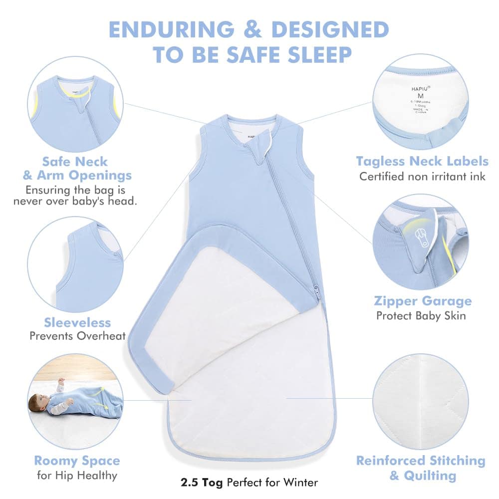 HAPIU presenta su Saco de Dormir para Bebé de Invierno, que está diseñado para mantener a tu pequeño cálido y cómodo durante las noches frías. Fabricado con rayón hecho de bambú, este saco de dormir es muy suave al tacto, hipoalergénico y ayuda a regular la temperatura corporal del bebé para garantizar un sueño apacible. La cremallera de 2 vías YKK en forma de J facilita su uso, ya que se abre completamente plana para permitir un fácil cambio de pañales o para secar la prenda en línea. Además, el espacio adicional para patear y crecer proporciona a tu bebé la libertad de movimiento sin riesgo de que se destape. La manta está reforzada con acolchado para asegurar una distribución uniforme del relleno y evitar la formación de bultos o desplazamientos. La seguridad es una prioridad, por lo que el saco de dormir cuenta con un garaje de cremallera para proteger la cara del bebé, así como aberturas para brazos y cuello dimensionadas según las últimas investigaciones en seguridad infantil. Este producto no solo es funcional y seguro, sino que también es un gran regalo para un Baby Shower, gracias a su calidad superior y color unisex que lo hace adecuado para cualquier bebé niña o niño. Disponible en tamaño S para 0-6 meses, M para 6-18 meses y L para 18-36 meses (2t – 3t), este Saco de Dormir para Bebé de Invierno de HAPIU es una elección excelente para asegurar el confort y la seguridad de tu pequeño durante las noches frías de invierno.