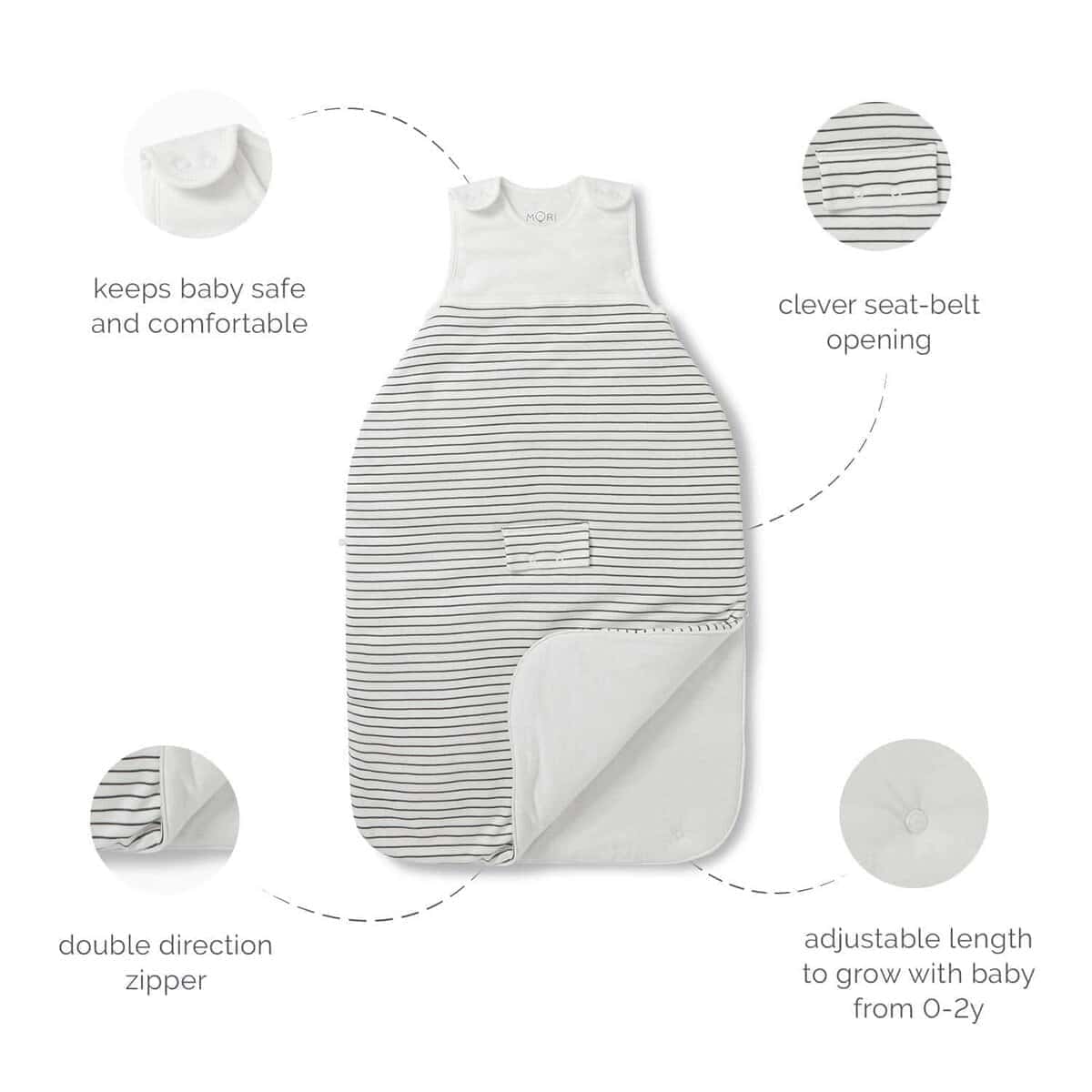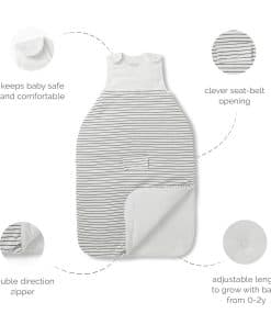 1. Comodidad para todas las estaciones: Diseñado para brindar comodidad durante todo el año, el Saco de Dormir Clever MORI para Bebés proporciona el calor ideal y la transpirabilidad, ajustándose a las distintas estaciones con su clasificación de 0.5 a 2.5 tog.