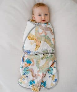 Saco de dormir Swaddle de bambú jersey nuevo en diseño Dragon Dance. Con una calificación de 0.5 TOG cuando se enrolla con las alas y 0.25 TOG cuando no se enrolla. Adecuado para bebés de 0 a 6 meses. Perfecto para mantener al bebé cómodo y seguro durante la siesta o la noche.