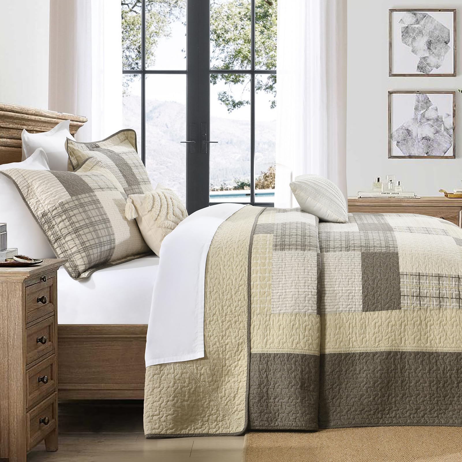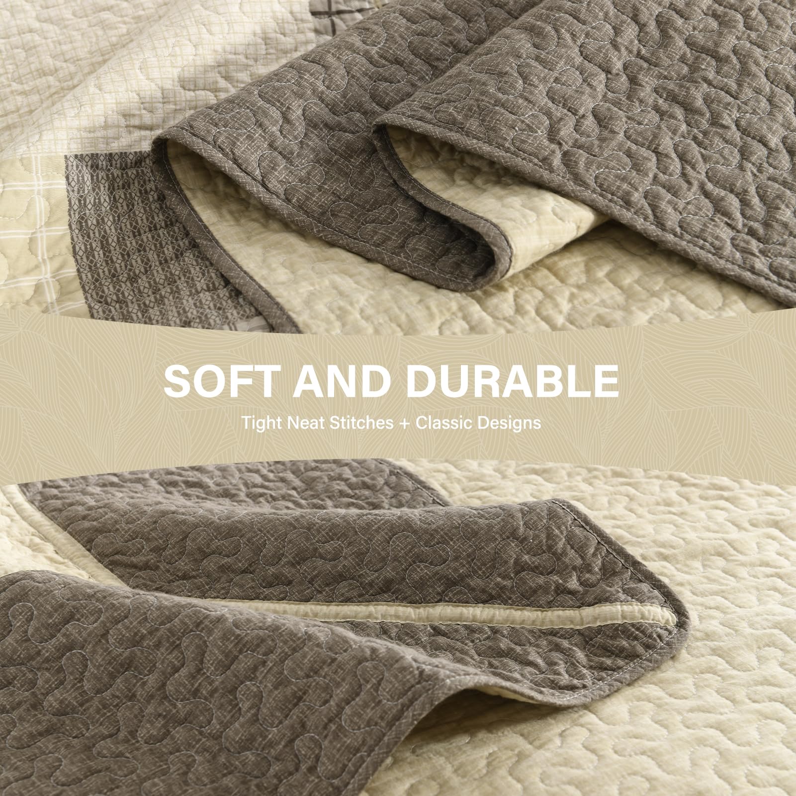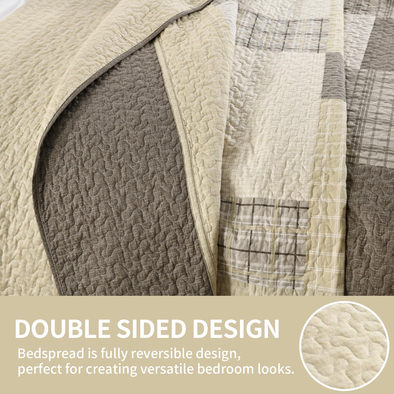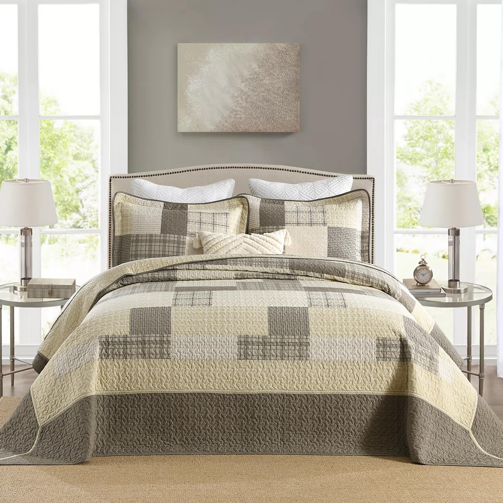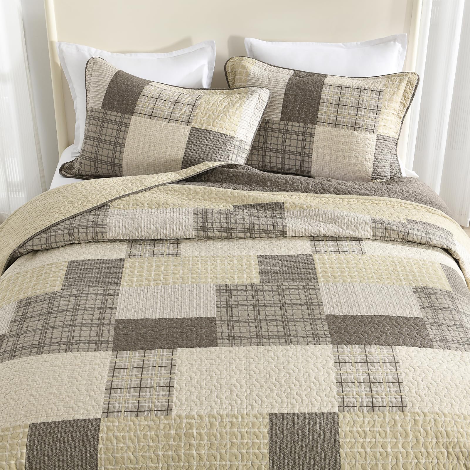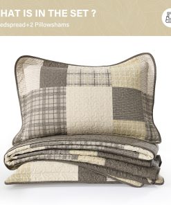La colcha/edredón Queen con dimensiones de 120″x102″ de SahSahCasa está hecha de 100% algodón natural tanto en la tela como en el relleno, lo que la hace más suave y saludable para tu piel. Su esquema de colores beige/marrón y sus patrones a cuadros le dan a tu habitación un nuevo aspecto y una atmósfera acogedora. Esta colcha reversible también complementa fácilmente la decoración de tu dormitorio, sala de estar, habitación principal, habitación de invitados, estudio, dormitorio y RVs. Es un gran regalo para tus seres queridos. Esta colcha oversized puede ser utilizada como un edredón, colcha, manta para cama o edredón ligero, siendo versátil para su uso. Su diseño de tres capas y el relleno de algodón 100% la hace ligera pero cálida, adecuada para su uso durante todas las estaciones del año. El juego de 3 piezas incluye una colcha de 120″ x 102″ y dos fundas de almohada de 20″ x 28″. Para su cuidado, se recomienda lavarla por separado en agua fría, secar a baja temperatura y no usar lejía. La colcha seguirá manteniendo su calor y forma original después del lavado, siendo una excelente opción si tienes mascotas en casa.