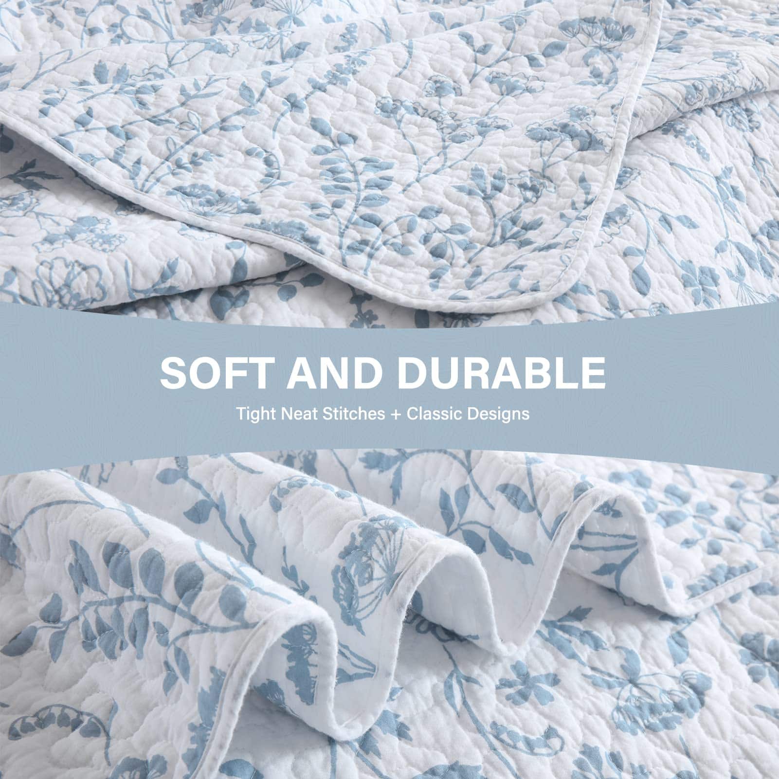 2. Ampliamente Aplicable y Decorativo – Este clásico juego de colcha en blanco diseñado con patrones florales botánicos azules hace que tu habitación sea brillante y acogedora. Este juego de colcha decorativo también puede combinar fácilmente con la decoración de tu dormitorio, sala de estar, habitation principal, habitación de invitados, estudio, dormitorio y RVs.