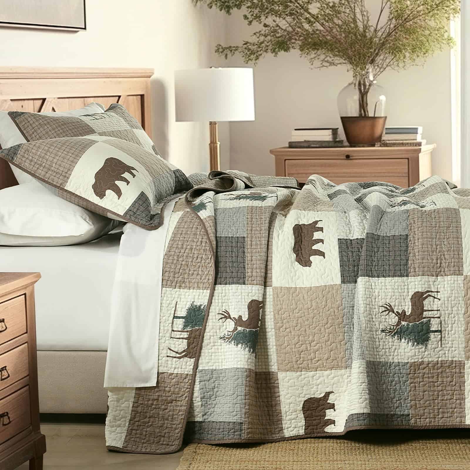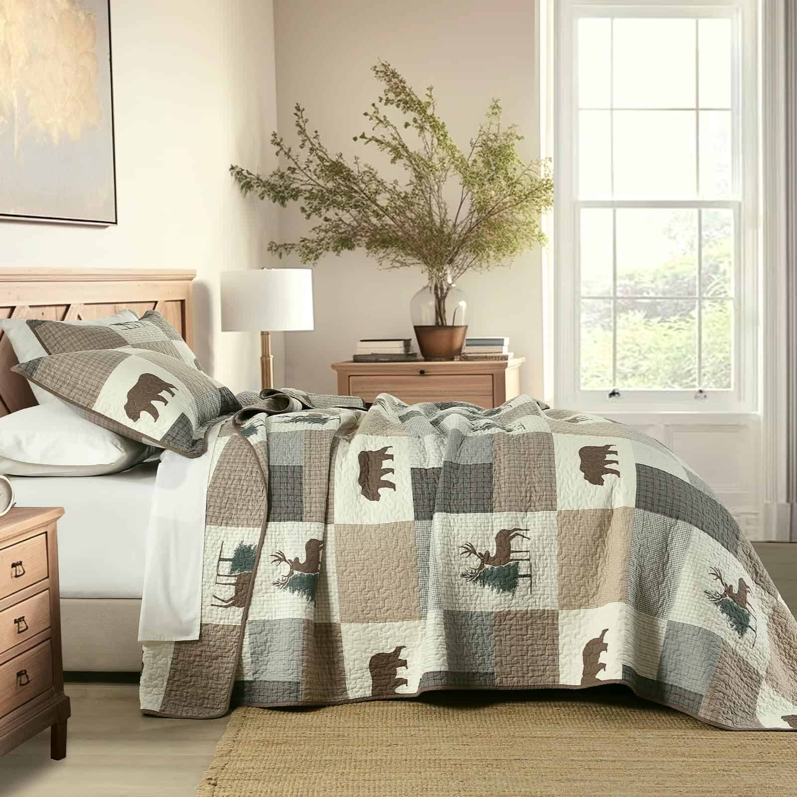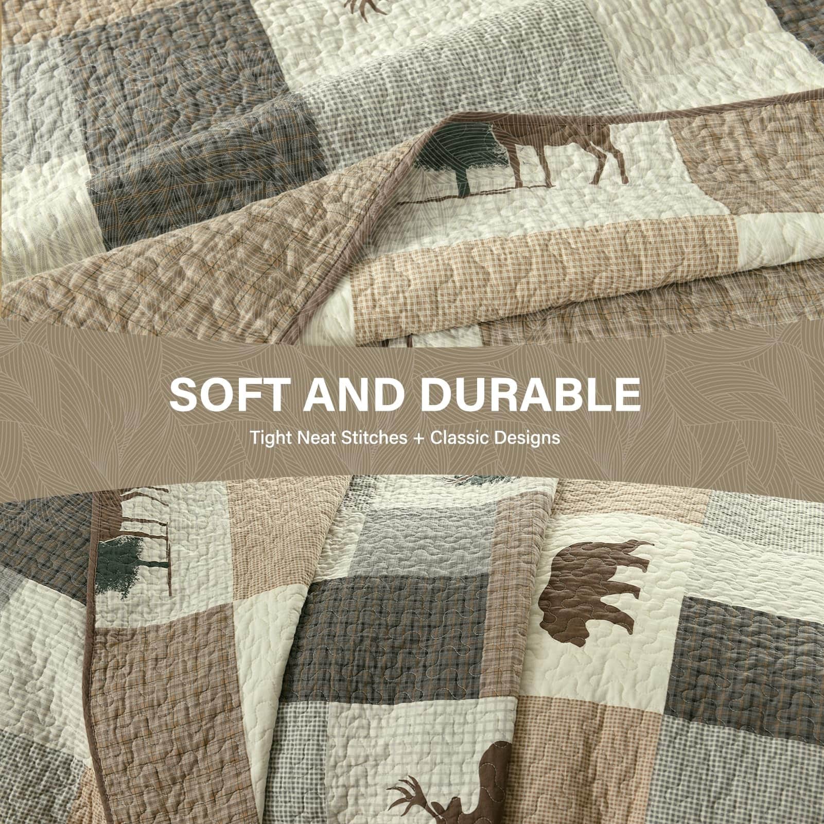 2. Ampliamente Aplicable y Decorativo: Este juego de edredón con temática de granja forestal en tonos marrón, gris y beige, ambos lados tienen diseños ricos en los mismos patrones de cuadros, plantas y vida silvestre, haciendo que tu habitación sea vibrante y acogedora. Este juego de edredón decorativo puede combinar fácilmente con la decoración de tu dormitorio, sala de estar, habitación principal, habitación de invitados, estudio, dormitorio y RVs.