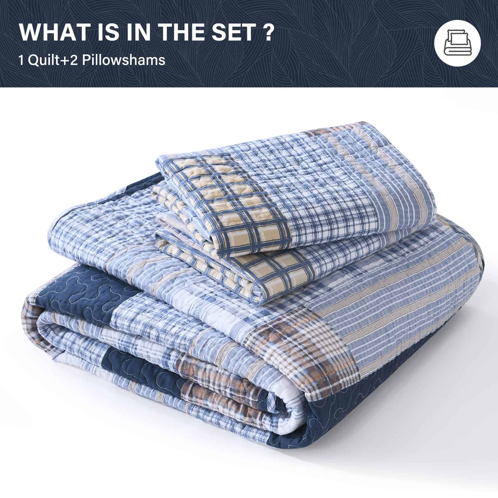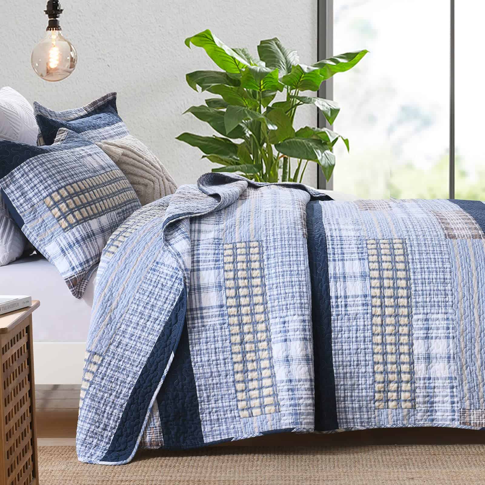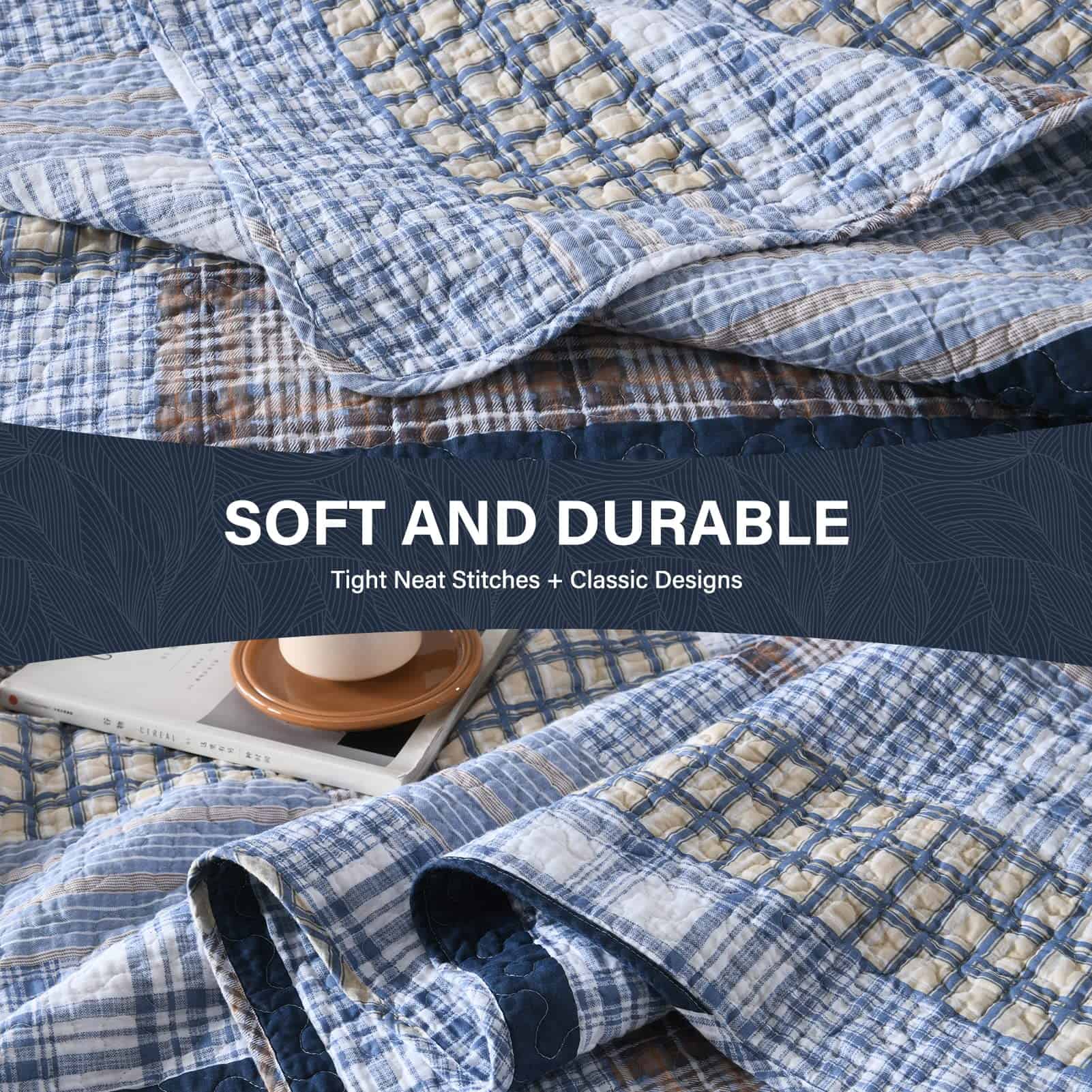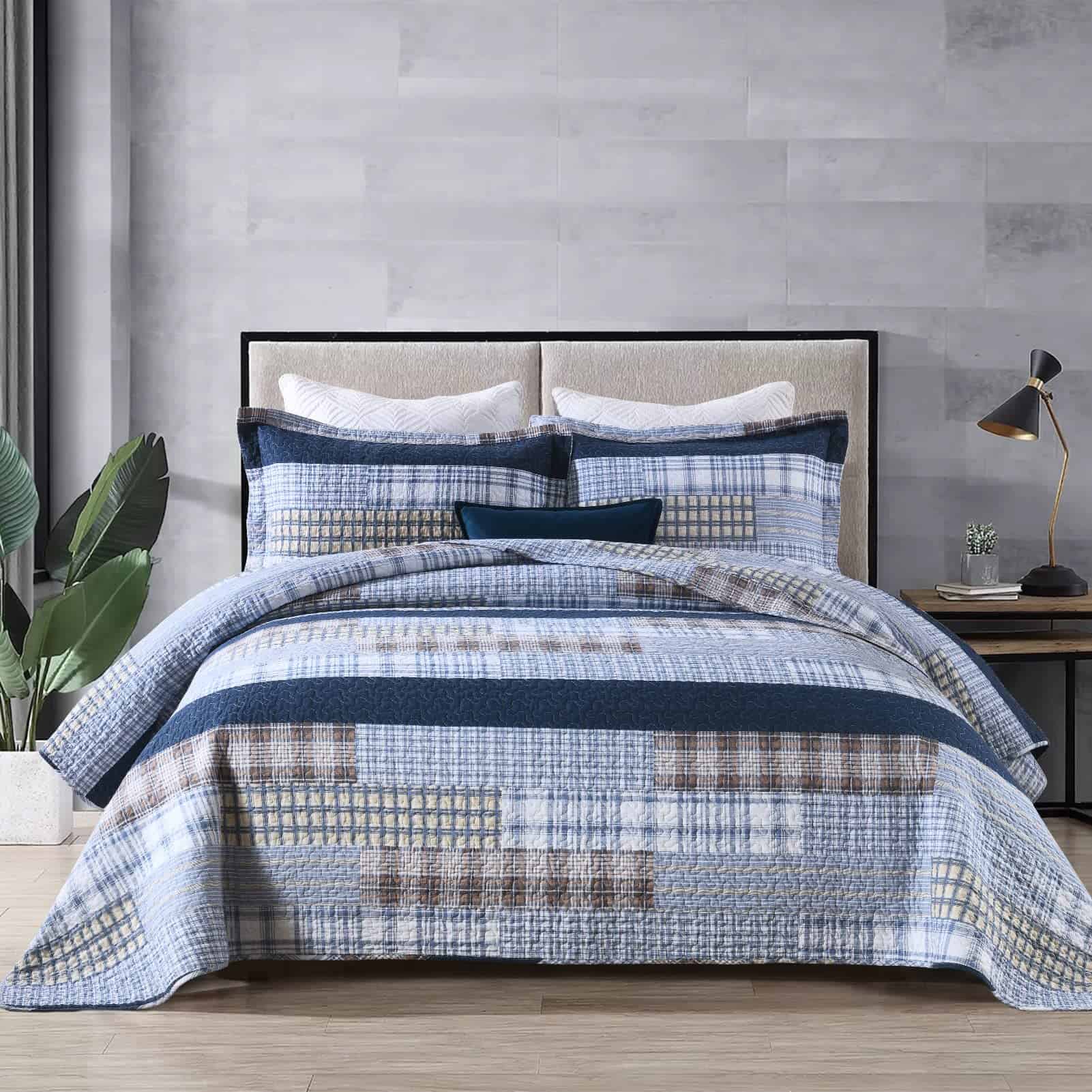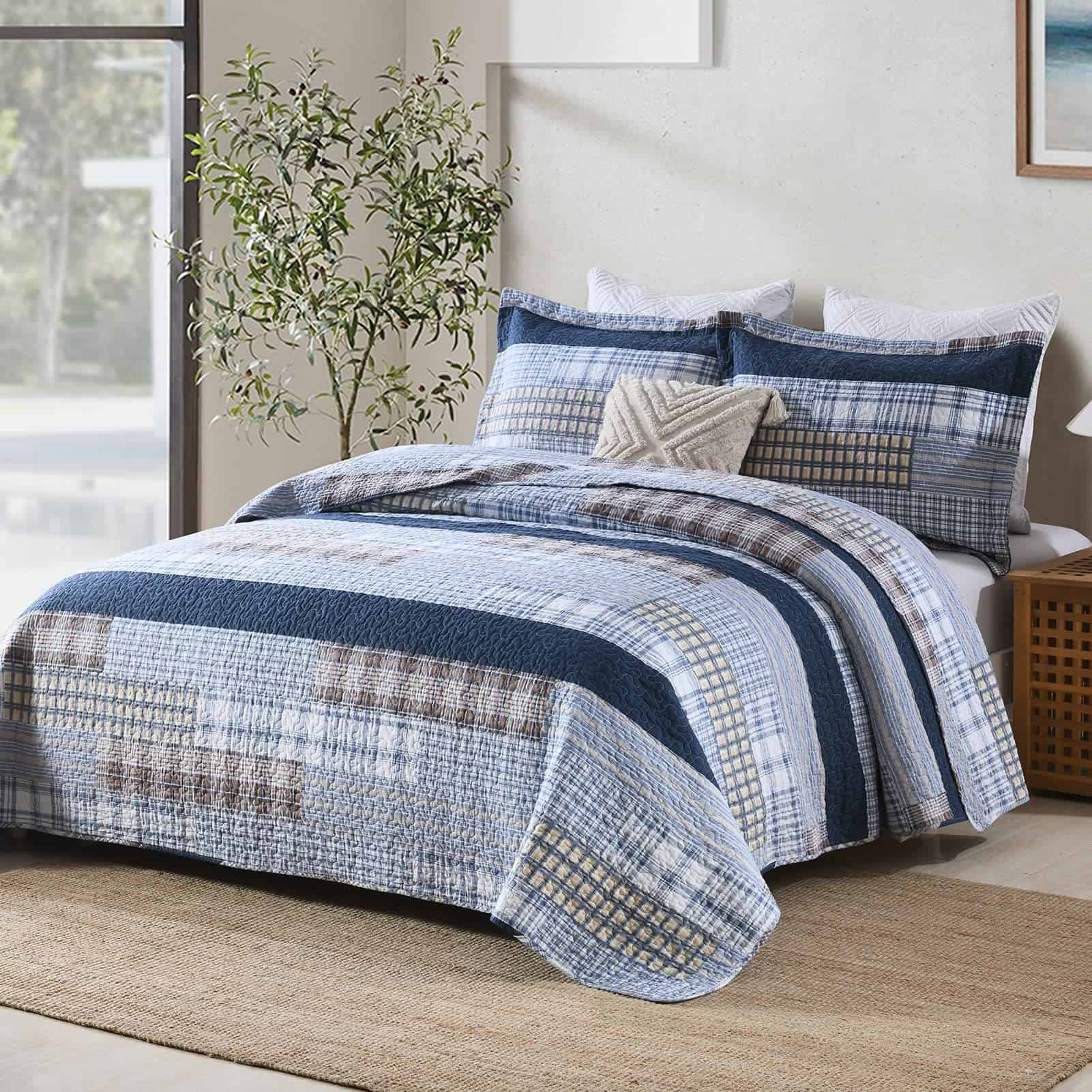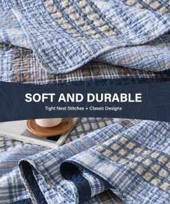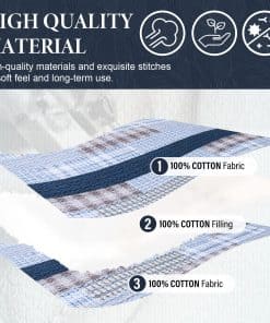 100% Algodón Natural – La tela y el relleno están hechos de algodón 100% natural, lo que lo hace más suave, más saludable, más transpirable y amigable con la piel. Es una excelente opción para personas con constituciones alérgicas o que tienden a sudar más durante el sueño. Ampliamente Aplicable y Decorativo – Este juego de edredón con clásico patchwork de cuadros y costuras dobles resistentes puede combinar fácilmente con la decoración de tu habitación, sala de estar, dormitorio principal, habitación de invitados, estudio, dormitorio y casas rodantes. Uso durante Todo el Año – Las costuras limpias y apretadas garantizan un uso duradero. El diseño de tres capas y el relleno de algodón 100% hacen que este juego de edredón sea ligero pero cálido, adecuado para primavera, verano, otoño, invierno y puede ser utilizado como juego de edredón, juego de colcha, colcha y juego de edredón. Se puede utilizar solo o con manta o edredón. Set de Edredón King de 3 Piezas Incluye – 1 Edredón: 98″ x 106″; 2 Fundas de almohada: 20″ x 36″. Instrucciones de Cuidado – Lavar a máquina por separado en agua fría, secar a baja temperatura, no usar lejía. El edredón conservará el calor y su forma original después de lavarlo. Si tienes mascotas, el edredón lavable también es una buena elección.