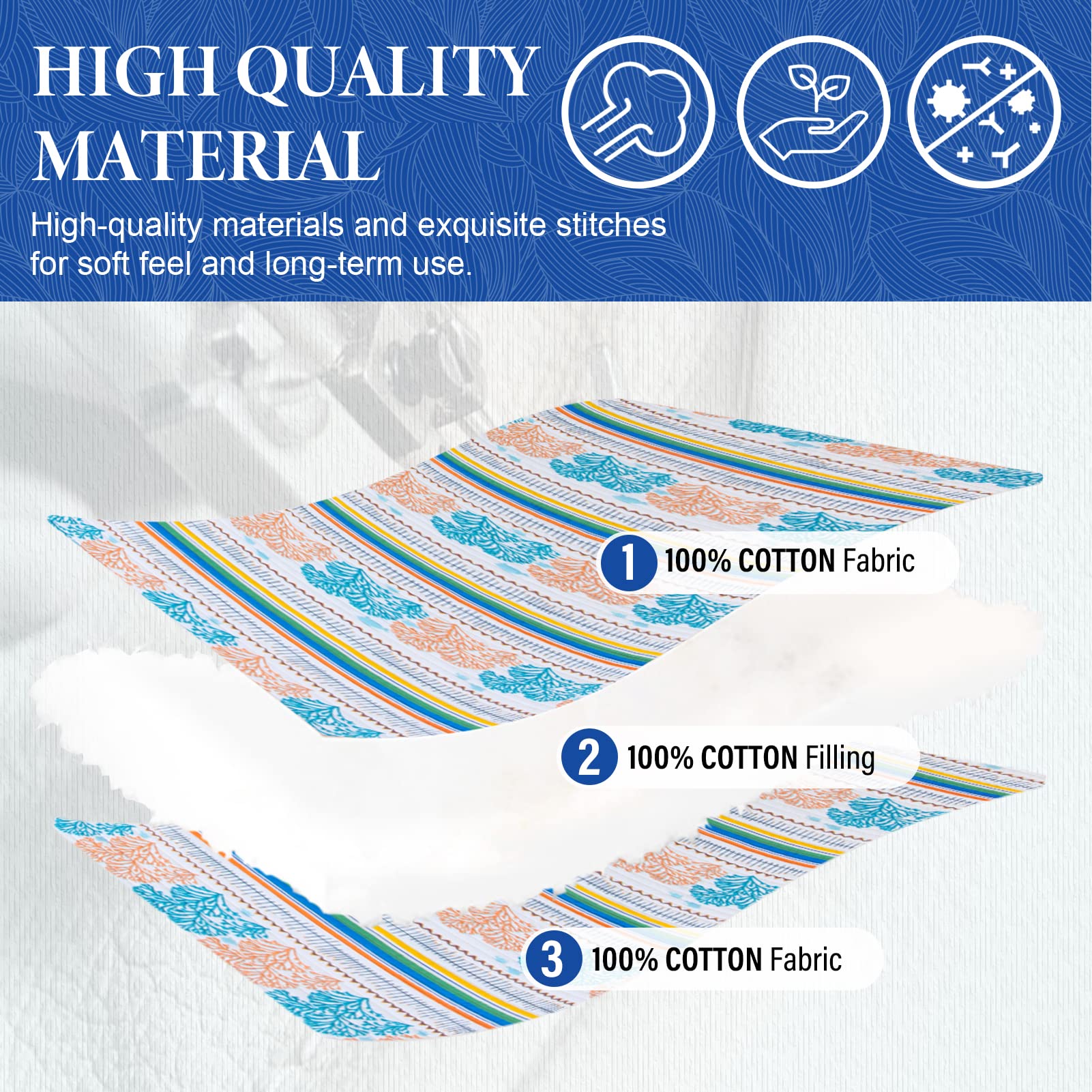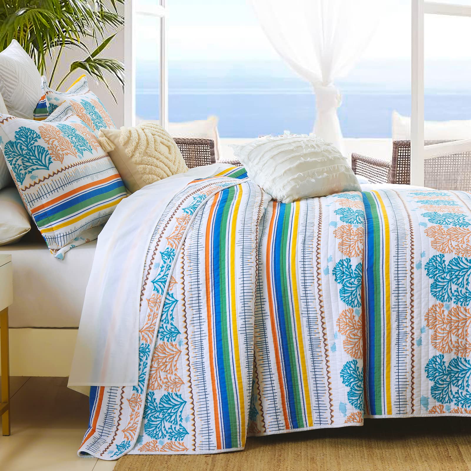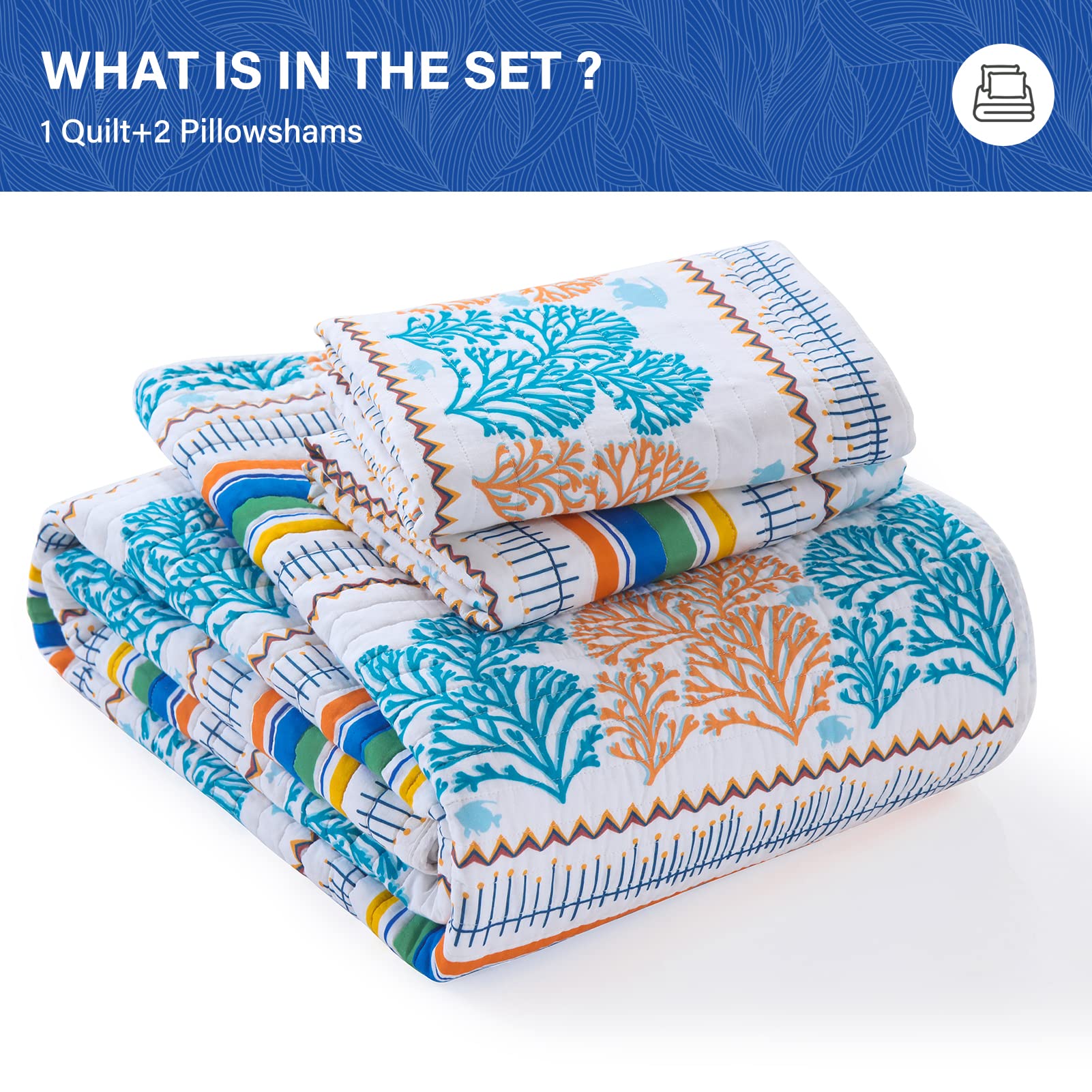 1. 100% Algodón Natural – La tela y el relleno están hechos de algodón 100% natural, es más suave y saludable, más transpirable y amigable con la piel. También es una buena opción para personas con una constitución alérgica o que tienden a sudar más al dormir. 2. Elección de Regalo – Un buen regalo para amigos, familias, niños, adolescentes, niños, niñas y para ti mismo. 3. Ampliamente aplicable y decorativo – Este juego de colchas de tema costero/oceánico en blanco diseñado con patrones de criaturas botánicas marinas y rayas hace que tu habitación sea luminosa y acogedora. Este juego de colchas decorativas también puede combinar fácilmente con la decoración de dormitorios, habitaciones de invitados, habitaciones infantiles, habitaciones para niños, habitaciones de adolescentes, salas de estar, habitaciones principales, estudios, dormitorios, campistas y RV. 4. Uso para todas las estaciones – Las costuras limpias y ajustadas garantizan un uso a largo plazo. El diseño de tres capas y el relleno de algodón 100% en el interior hacen que este juego de colchas sea ligero pero cálido, adecuado para primavera, verano, otoño, invierno y se puede utilizar como juego de colchas, juego de cubrecamas, colcha y juego de edredón. Se puede usar solo o con manta o edredón. 5. Juego de Colcha King de 3 Piezas Incluye – 1 Colcha: 98″ x 106″; 2 Fundas de almohada: 20″ x 36″.
