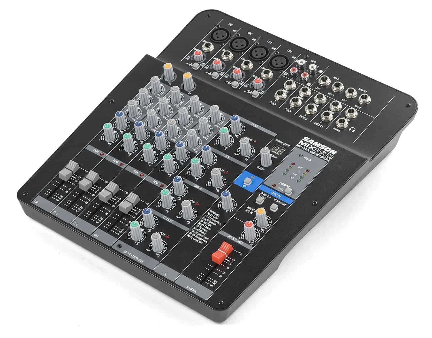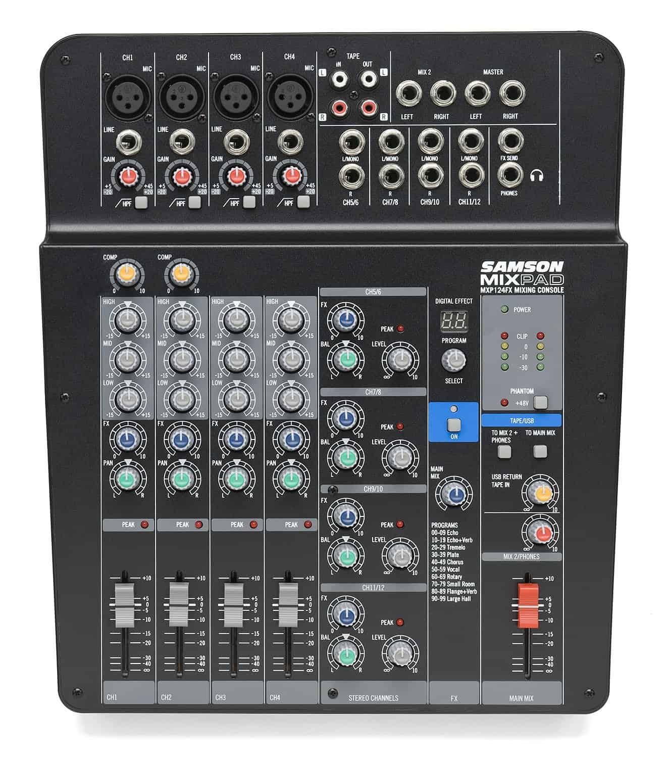 El mezclador de 12 canales Samson MixPad MXP124FX te ofrece efectos integrados de alta calidad para agregar el toque final a tu mezcla. Aún mejor, una conexión USB integrada facilita la grabación de tu mezclador en tu software DAW en tu computadora. Para ajustar tu sonido, tienes compresores en los dos primeros canales y un ecualizador de 3 bandas en cada canal. Cuando necesites un mezclador de formato pequeño capaz que suene genial y no rompa tu cuenta bancaria, GearNuts puede recomendar el mezclador de 12 canales Samson MixPad MXP124FX. Mezclador de 12 canales Samson MixPad MXP124FX en resumen: Gran calidad de sonido para escenario y estudio. Efectos integrados de alta calidad para un sonido pulido. USB integrado para grabación. Gran calidad de sonido para escenario y estudio El mezclador Samson MixPad MXP124FX te brinda la conectividad que necesitas para la mayoría de las aplicaciones de mezcla de formato pequeño. Cuatro preamplificadores de micrófono están listos para tus micrófonos, con alimentación fantasma y un filtro de paso alto para cada entrada. Y