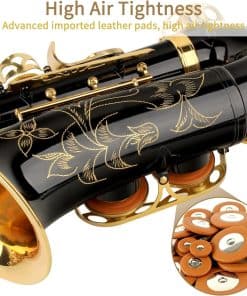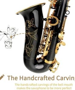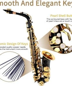 El saxofón alto Eb es adecuado para estudiantes, principiantes, conciertos escolares, profesionales y jugadores de cualquier nivel. Su ajuste de tono profesional y excelente calidad de sonido lo convierten en una agradable sorpresa. Fabricado con material de cobre H68 seleccionado y almohadillas de cuero importado avanzadas para una alta estanqueidad al aire. Incluye un muelle de aguja de cobre de calidad mejorada para hacer el instrumento más suave. Su acabado lacado en oro transparente y duradero junto con teclas contorneadas con incrustaciones de falso nácar aportan elegancia. Los botones de concha tallados a mano y de alta calidad hacen que este saxofón sea perfecto. Además, viene con una garantía del fabricante de 1 año contra defectos.