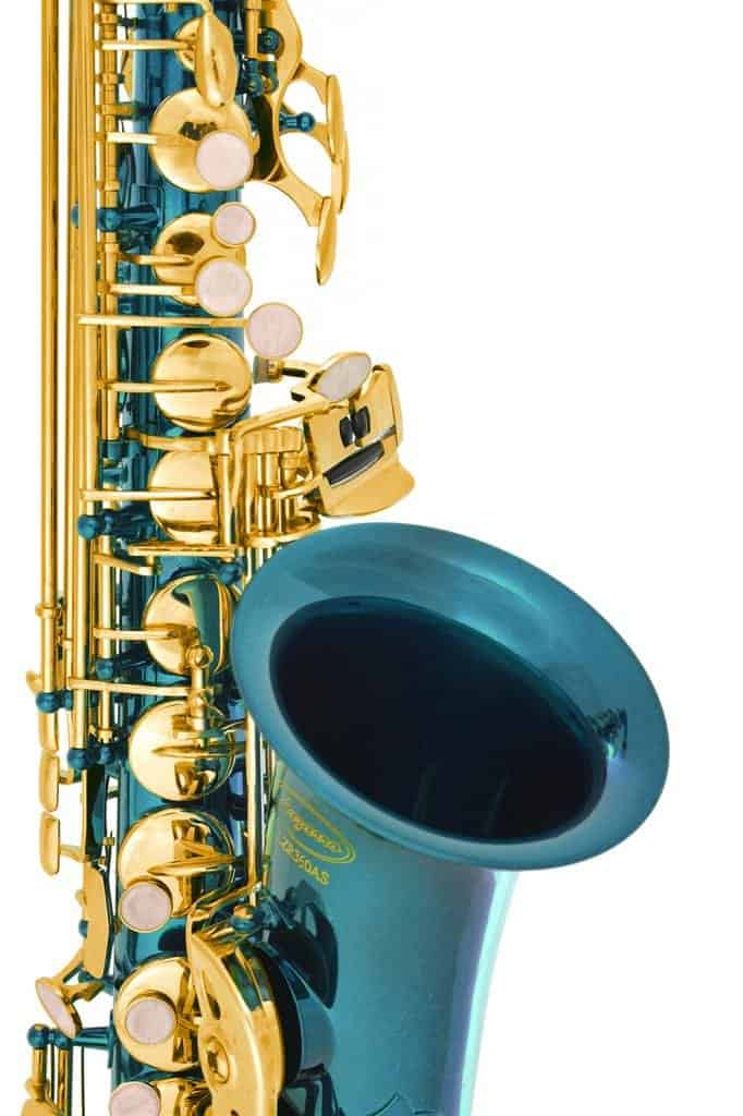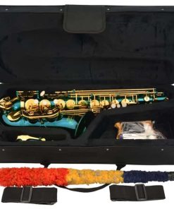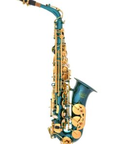 Saxofón Alto Lazarro en clave de E-flat Eb hecho de latón real con llaves de Eb y tecla alta F. Decoración de campana grabada a mano con incrustaciones de imitación de madre de perla. Almohadillas de cuero italiano con resonadores metálicos, tornillos de altura de tecla ajustables y reposapiés de metal.