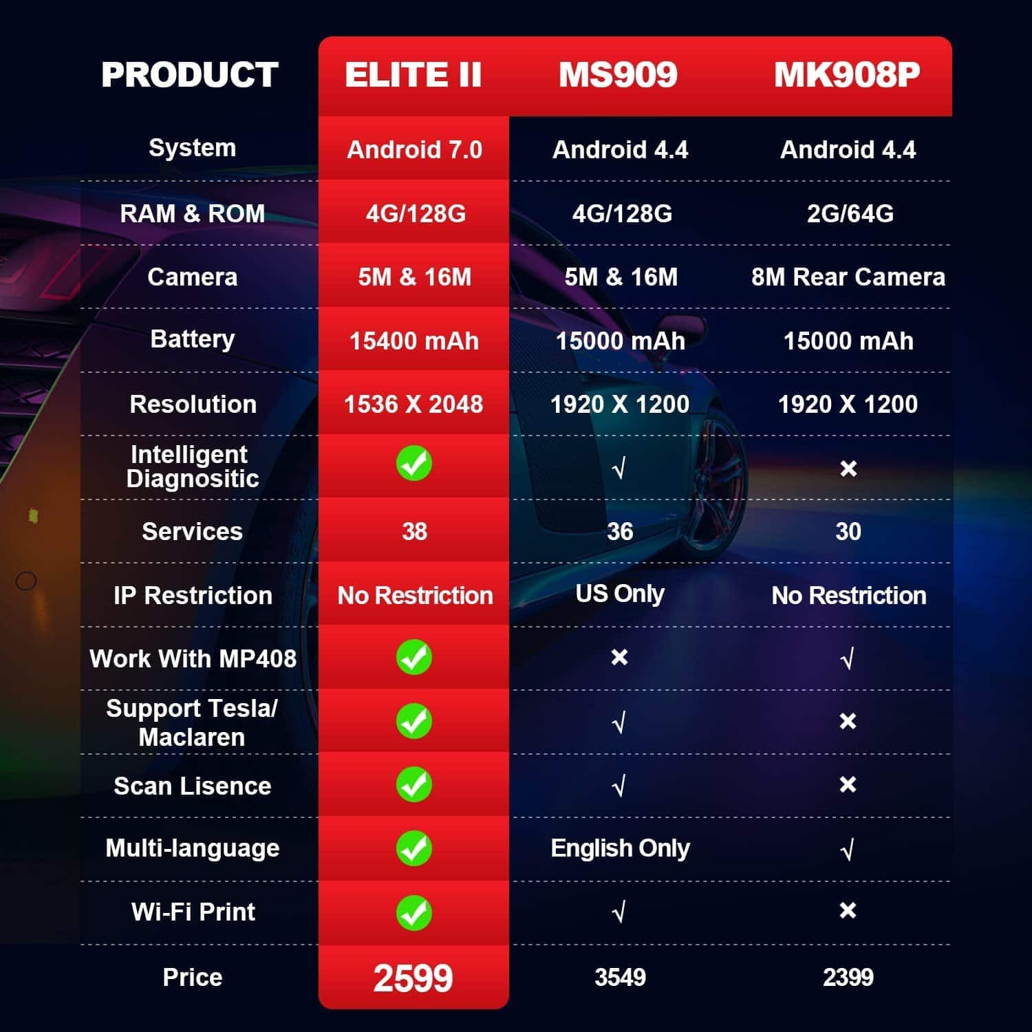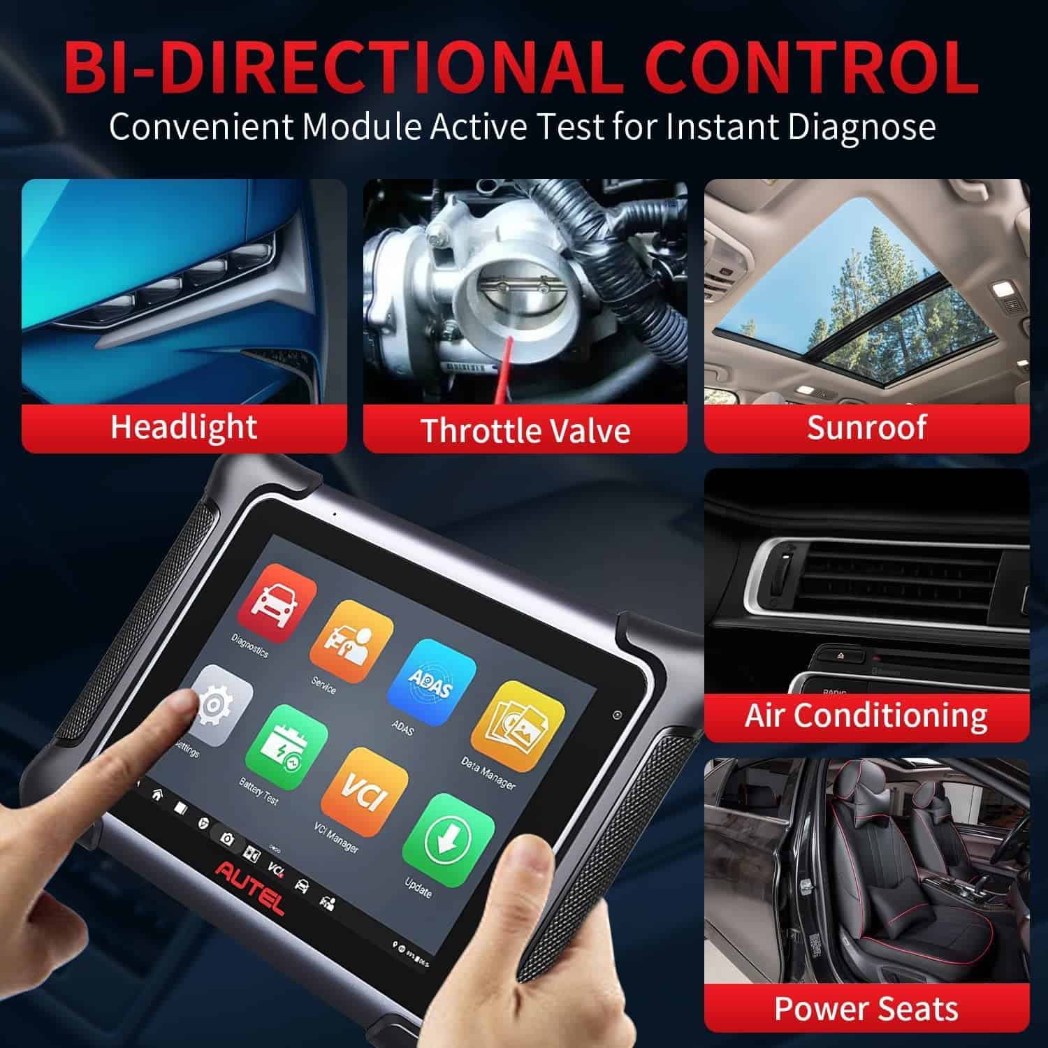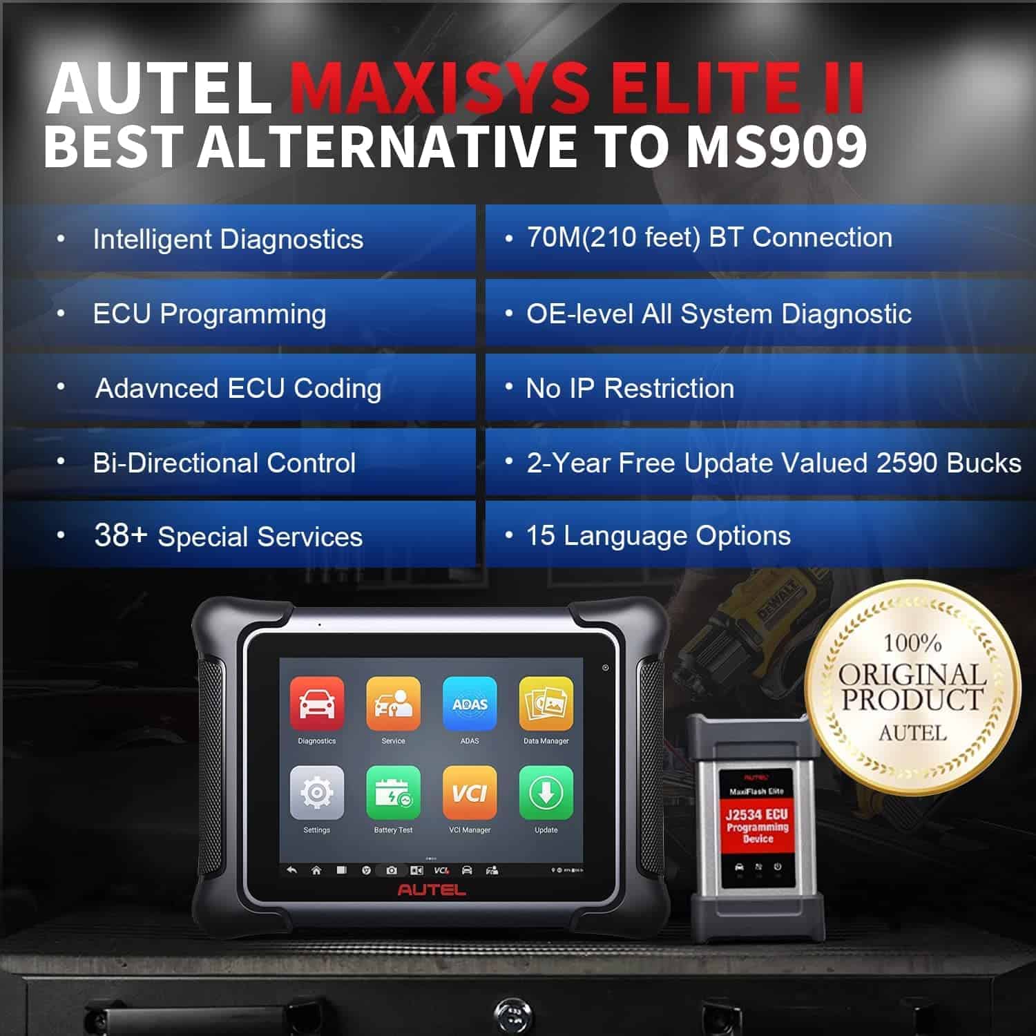 5. Control Bidireccional y Diagnóstico de Todos los Sistemas Autel Elite 2 cuenta con la misma capacidad que una herramienta de escaneo de grado de concesionario, pero con una cobertura de vehículos mucho más amplia, capaz de realizar un diagnóstico profundo en el 99% de los vehículos OBDII (excepto camiones pesados): información de la ECU, leer/borrar códigos, datos en vivo, datos de fotograma congelado, VIN automático, escaneo de licencias, impresión Wi-Fi, prueba activa, etc. Autel Elite II puede enviar señales de comando a las ECUs para probar la funcionalidad e integridad de los actuadores en tan solo unos minutos. 6. Garantía de 1 Año & 24 Meses de Actualización Gratuita & Servicio al Cliente de por Vida La herramienta de escaneo Autel MaxiSys Elite II está respaldada por soporte técnico profesional las 24 horas, con garantía de 1 año, 2 años de actualización de software gratuita (Valorado en 2590 Dólares), reembolsos y cambios de 30 días. (Extra: A diferencia de Autel MaxiSys Elite/MS908S Pro, MaxiSys Elite II no tiene restricciones de IP).
